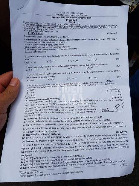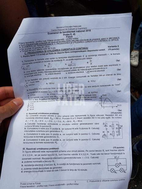 Bacalaureat 2018, rezolvare subiecte fizică. Examenul la Fizică a început la ora 9.00, iar candidaţii au avut la dispoziţie trei ore pentru a rezolva subiectele. Pentru această probă, sunt obligatorii toate subiectele din două arii tematice dintre cele patru prevăzute în programă, respectiv: A. Mecanică, B. Elemente de termodinamică, C. Producerea și utilizarea curentului continuu, D. Optică. Fiecare dintre cele două arii tematice conține câte trei subiecte mari. (Vezi și Rezolvarea subiectelor la matematică, la Bacalaureat 2018)