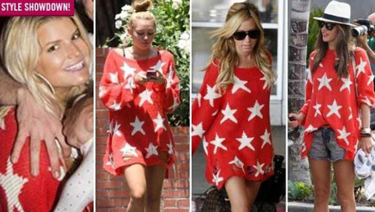 Astfel, Myley Cyrus, jessica Simpson, Ashley Tisdale sI Alessandra Ambrosio au fost vazute, in diferite ocazii, cu acelasi model de bluza. Obiectul vestimentar cu pricina este marca Wildfox sI poate fi comandat pe internat, pretul acestuia fiind de 220 de dolari. Pe langa modelul pe rosu, mai sunt disponibile modele sI pe alte doua culori – negru sI albastru, evident cu stelute de culoare alba.