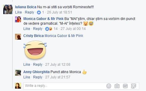 Monica Gabor şi Ramona au făcut un live pe facebook iar comentariile fanilor nu s-au lăsat prea mult aşteptate. A existat o anume persoană care i-a scris, textual ”nu m-ai ştiţi sa vorbiţi Romîneşte”, un comentariu cu vădite greşeli gramaticale. Pe principiul ”râde ciob de oală spartă”, vorbă veche din popor, Monica i-a răspuns cu o replică memorabilă. ”Ba MAI ştim, chiar ştim să vorbim din punct de vedere gramatical M-AI înţeles?”. Demonstraţia Monicăi Gabor asupra modului în care se foloseşte cratima i-a atras admiraţia celorlalţi prieteni virtuali. ”Punct atins, Monica” a comentat o admiratoare.