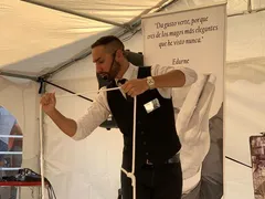 “În mod normal, dacă trebuie să fac acest număr de mai multe ori pe zi, îl fac cu apă. Dar azi, fiind o ocazie specială, am hotărât să folosesc vin. Nu chiar trei ore, pentru că am nevoie de o toaletă”, a explicat tânărul iluzionist.