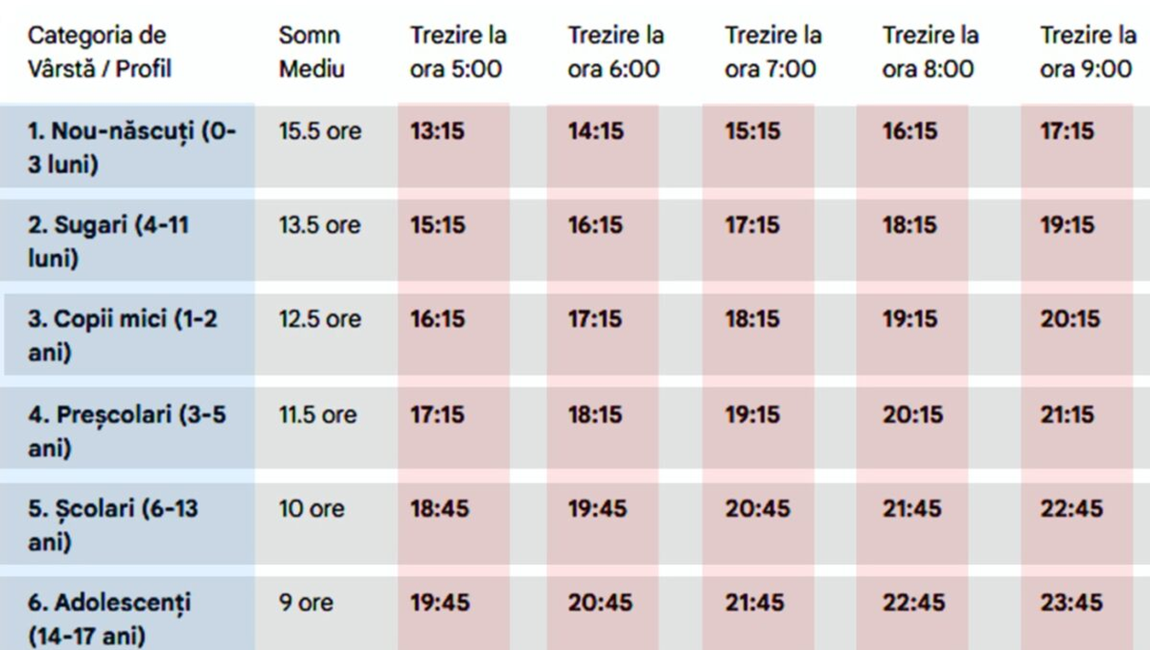 Un nou ghid orientativ privind orele de somn scoate în evidență diferențe semnificative între grupele de vârstă și stilurile de viață, arătând clar că ora ideală de culcare nu este aceeași pentru toată lumea. Datele sunt structurate într-un tabel care corelează durata medie de somn recomandată cu ora la care o persoană dorește să se trezească, oferind o imagine practică asupra modului în care somnul ar trebui adaptat pe parcursul vieții.
