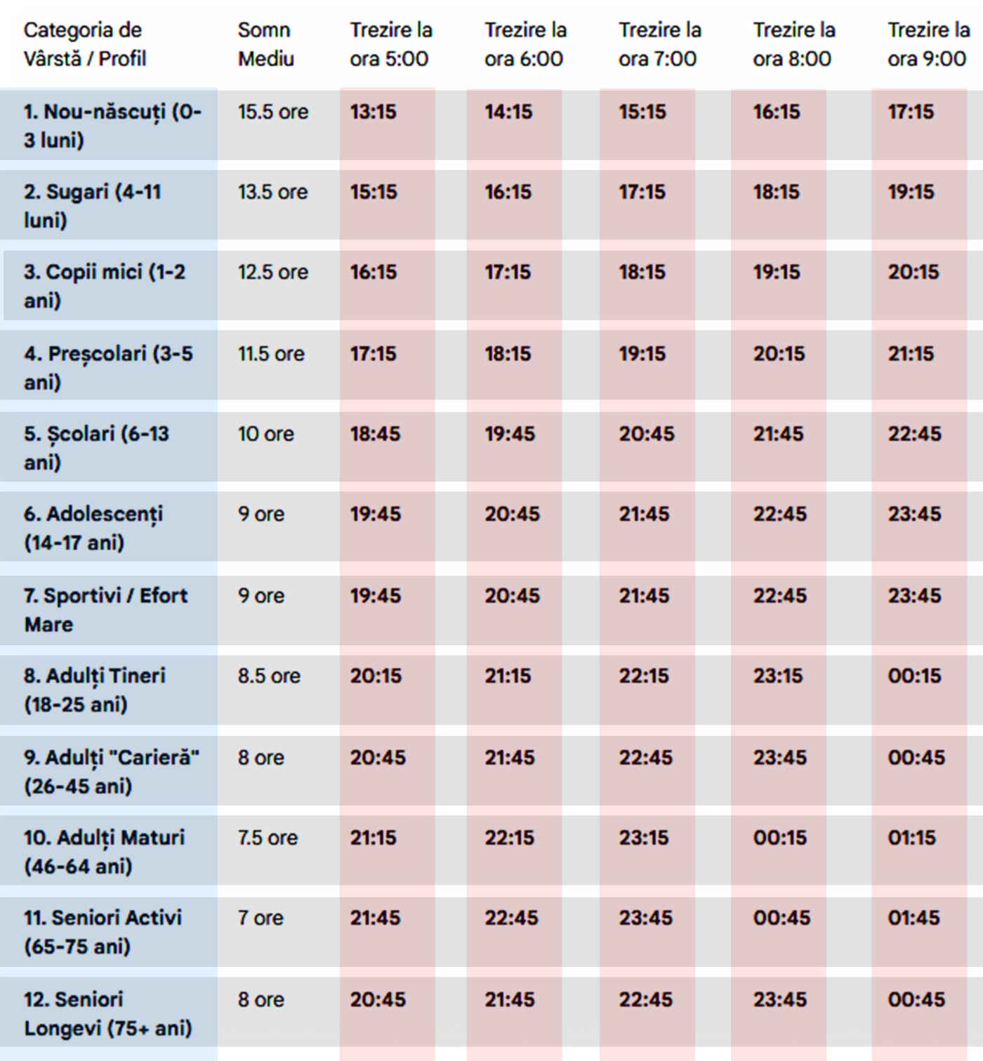 Potrivit acestor repere, nevoia de somn este maximă în primele luni de viață. Nou-născuții cu vârsta de până la trei luni au nevoie, în medie, de aproximativ 15 ore și jumătate de somn pe zi. În cazul în care trezirea are loc la ora 7 dimineața, ora de culcare ar trebui să fie în jurul orei 15:15 din ziua precedentă, ceea ce subliniază ritmul complet diferit al somnului în această etapă timpurie. Pe măsură ce copilul crește, durata totală de somn scade treptat, dar rămâne ridicată în primii ani de viață.