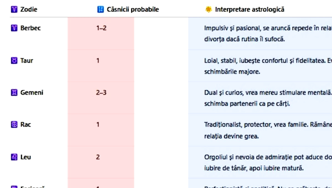 Berbec (1-2 căsnicii). Impulsiv și pasional, te arunci repede în relații. Poți divorța dacă rutina te sufocă.