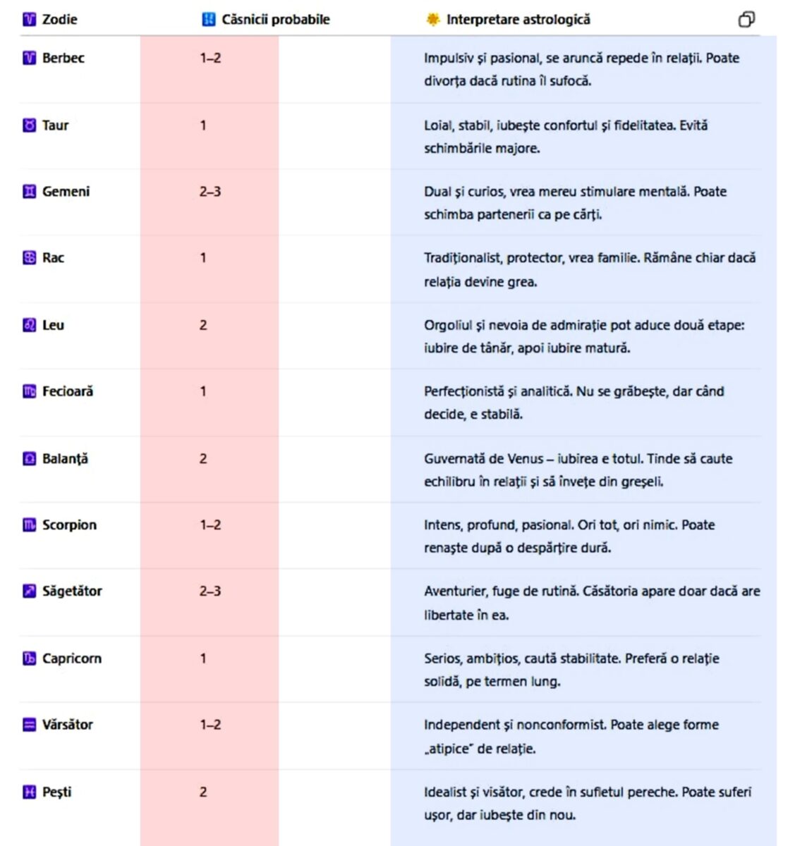 Gemeni (2-3 căsnicii). Ești dual și curios, vrei mereu stimulare mentală. Poți schimba partenerii ca pe cărți.