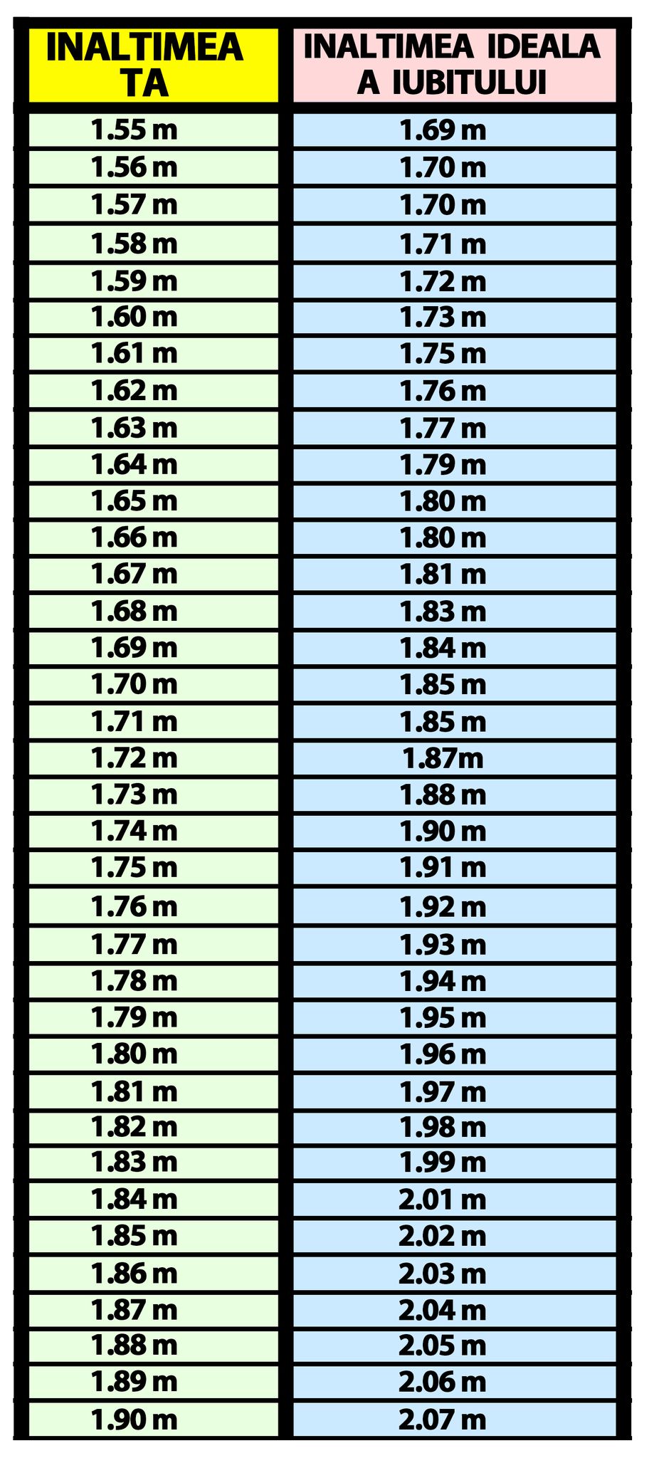 Calculul este simplu și l-am făcut. De exemplu, o femeie care măsoară 1,58 m ar trebui să fie cu un bărbat cu o înălțime de 1,71 m. Sau o femeie cu o înălțime de 1,69 m ar trebuie să își găsească un partener cu o înălțime de 1,84. Pentru a simplifca lucrurile am făcut calculul pentru o plajă largă de înălțimi pe care le găsiți în tabelul de mai jos.