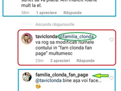 Într-unul dintre primele comentarii strânse de postarea soțului Gabrielei Cristea, un internaut a scris: “Voi face ceva minunat pentru voi. Și chiar sper din suflet să vă placă. Am muncit foarte mult la el”. Când a văzut cum s-a semnat acesta, Tavi Clonda a răbufnit și i-a cerut imediat să schimbe numele contului: “@familia_clonda, vă rog să modificați numele contului în «familia clonda fan page». Mulțumesc”. Rugămintea cântărețului a fost ascultată și îndeplinită imediat: “@taviclonda, bine, așa voi face…”. După cum puteți vedea în a treia poză din galeria foto a articolului, modificările au fost realizate întocmai.