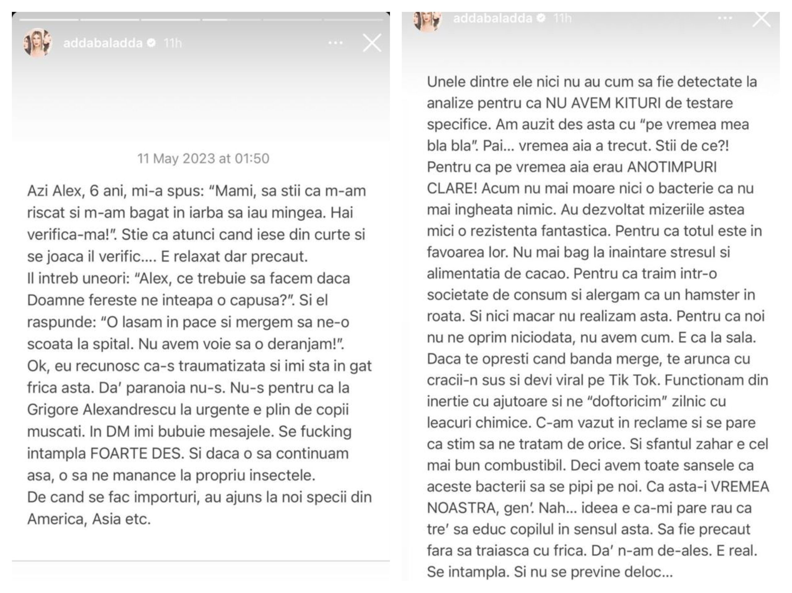 Nu avem voie să o deranjam!”. Ok, eu recunosc că-s traumatizată și îmi stă în gât frica asta. Da’ paranoia nu-s. Nu-s, pentru că la spital, la urgențe, e plin de copii mușcați. În DM îmi bubuie mesajele. Se fuc##ng întâmplă FOARTE DES. Și dacă o să continuăm așa, o să ne mănânce la propriu insectele. De când se fac importuri, au ajuns la noi specii din America, Asia etc”, a scris Adda pe Instastory.