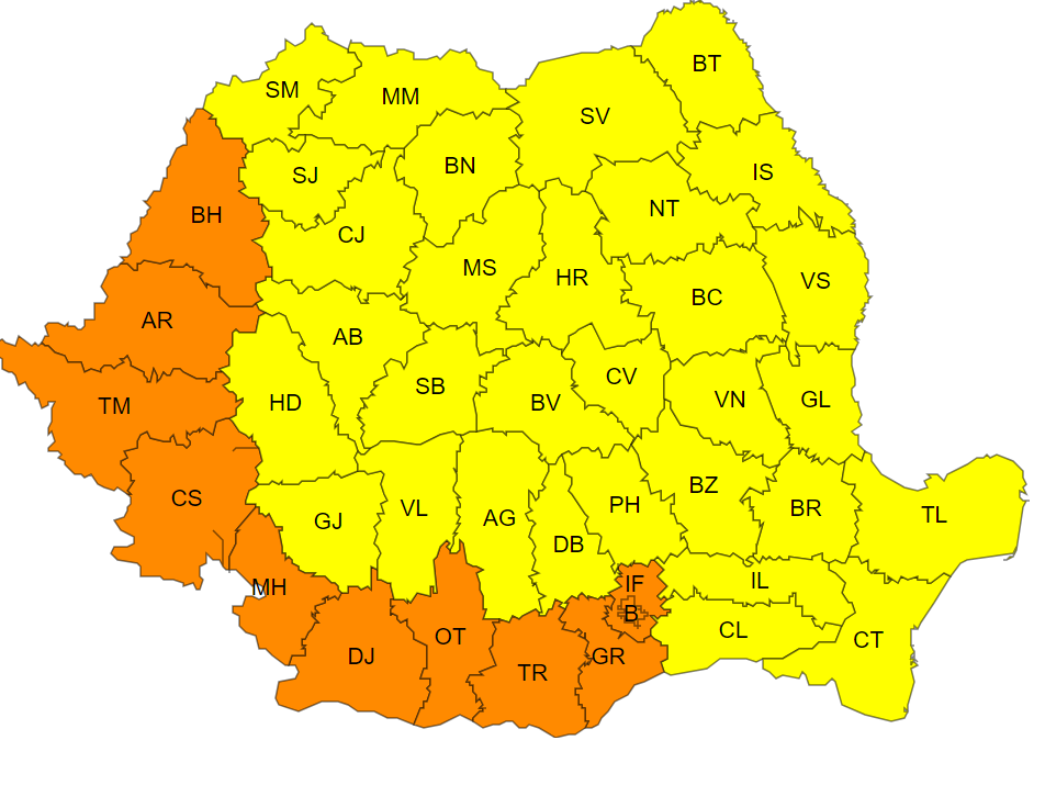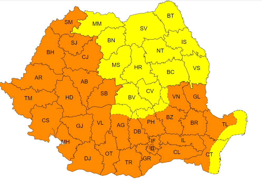 De asemenea, în vigoare este și un cod portocaliu de caniculă ce vizează zona de sud-vest a țării. Aici temperaturile din termometre urcă până la aproape 39 de grade, însă se vor resimți ca 43 de grade.