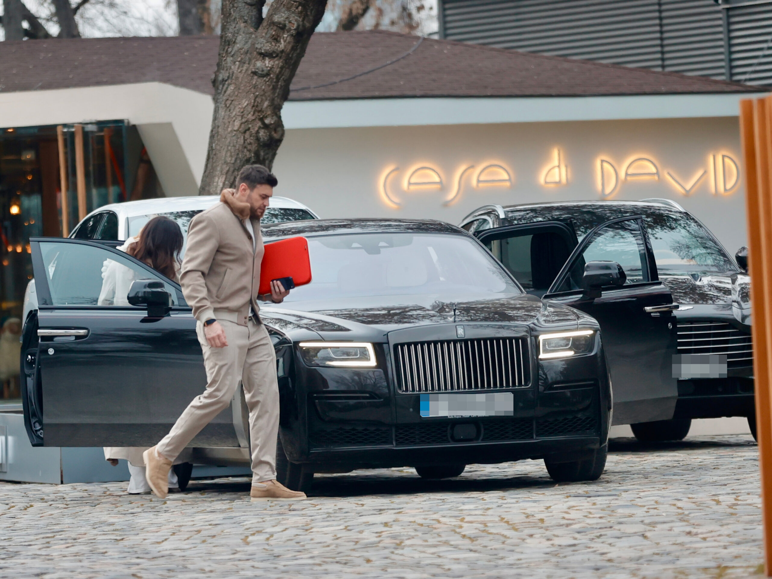 După ce cina s-a încheiat, Rolls-Royce-ul Ghost Black Badge a fost adus la intrare, iar parcagiul, genul de om care știe exact când trebuie să apară, a deschis prompt ușa din dreapta. Doar că lucrurile nu se fac niciodată pe repede-înainte când ești mamă înainte de toate.