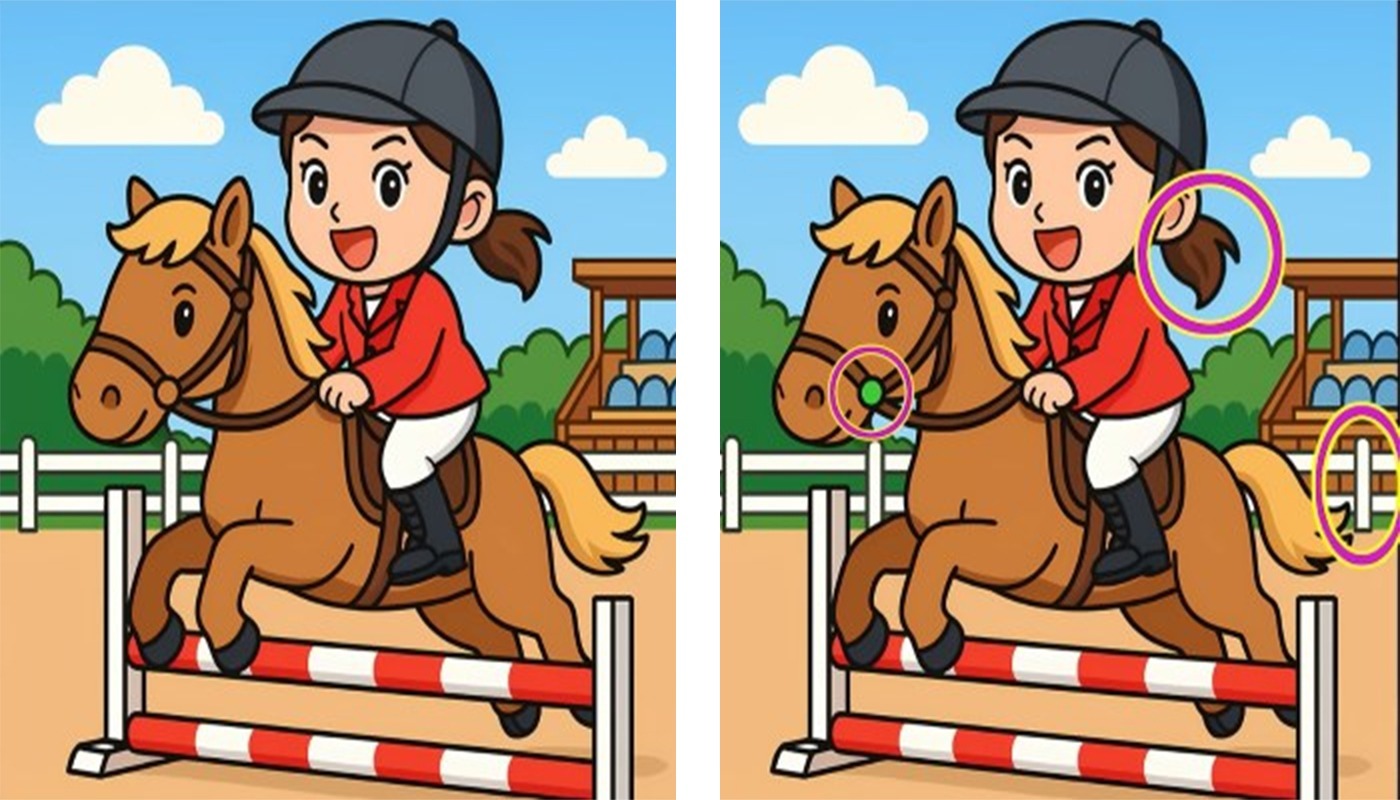 Puzzle-urile de tip „găsește diferențele” sunt foarte populare pe internet și sunt îndrăgite de oameni de toate vârstele! Iată o provocare distractivă pentru tine: vei vedea o fată călărind un cal. Între cele două imagini sunt ascunse 3 mici diferențe, iar provocarea ta este să le găsești pe toate în doar 47 de secunde.