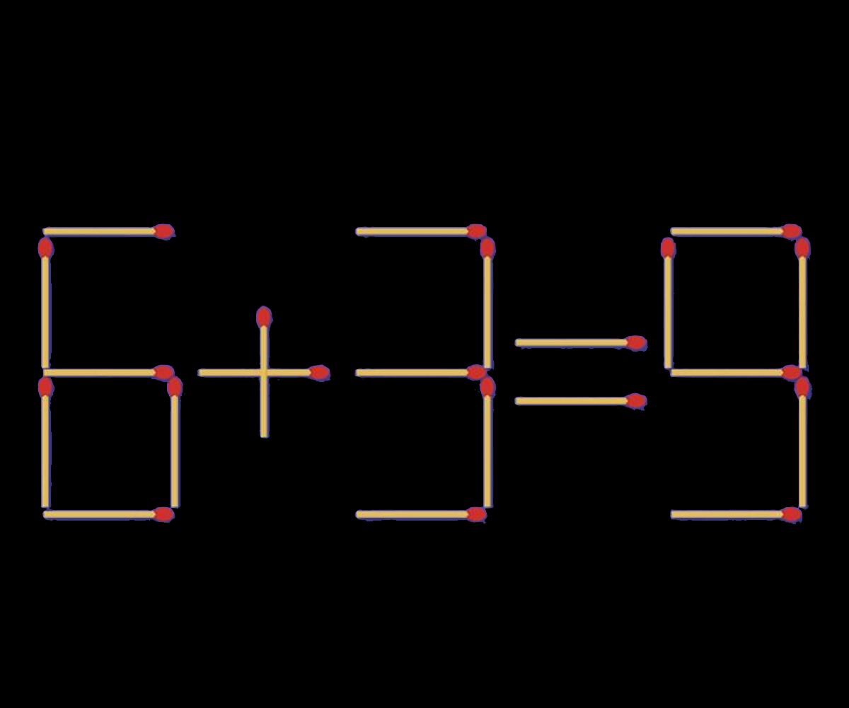Prima transformare constă în mutarea celui de-al doilea băț așezat vertical, ce formează cifra „6”. Astfel va rămâne cifra „5”, iar bățul de chibrit va fi mutat în componența cifrei „4”, de la final, în spațiul gol, în poziție orizontală. În acest fel vom avea următoarea operație matematică: „5+4=9”, ceea ce este corect.