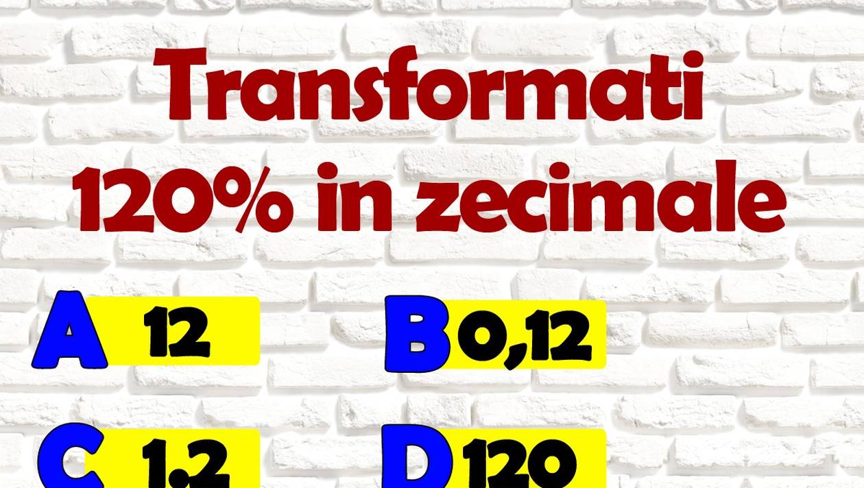 Trebuie să transformați 120% în zecimale, iar testul de inteligență vă oferă 4 variante de răspuns. Acestea sunt: A) 12, B) 0,12, C) 1.2, D) 120. Însă, care să fie, oare, răspunsul corect? Pentru a afla răspunsul corect, trebuie să împărțiți procentajul. Răspunsul final este C) 1.2.