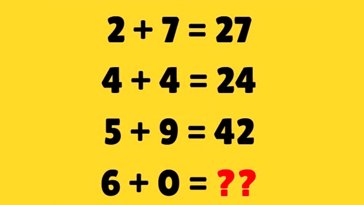 În imagine este prezentat un puzzle matematic în care cititorii trebuie să identifice numărul lipsă. Provocarea constă în rezolvarea exercițiului în doar 7 secunde. Avem următoarele operații: 2+7 = 27, 4+4 = 24, 5+9 = 42, iar necunoscuta este 6+0=?
