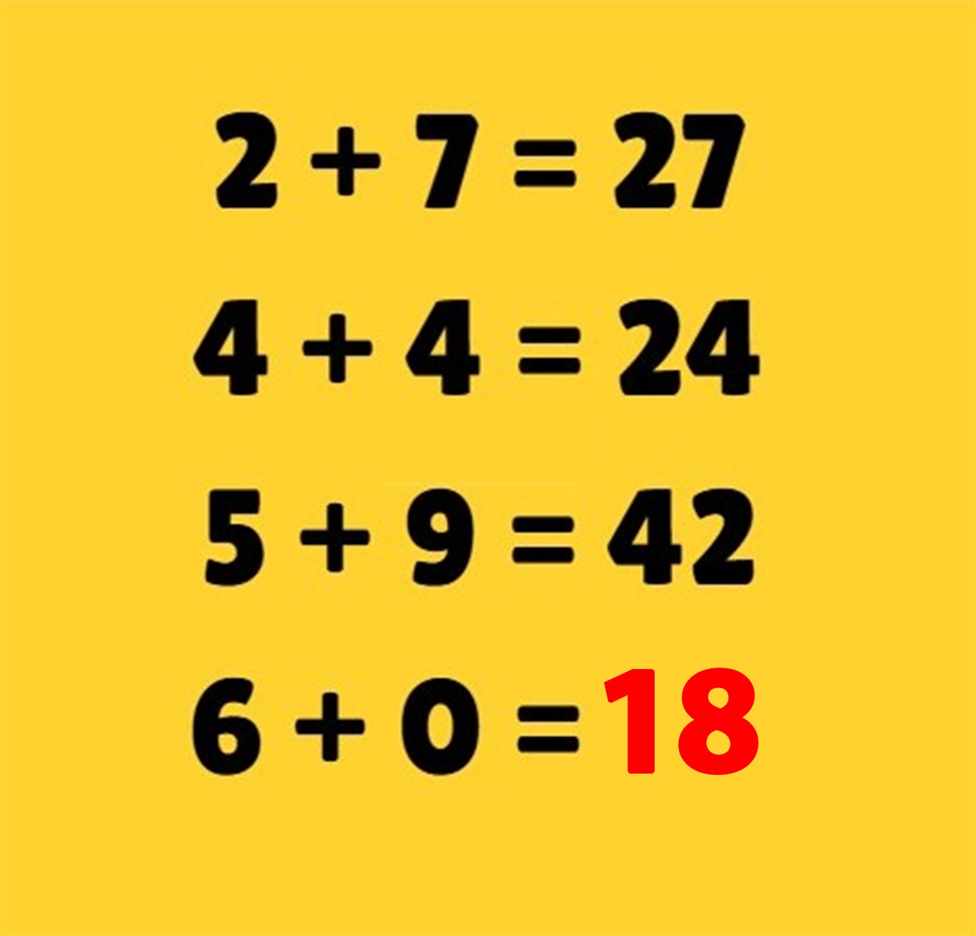 Pentru a găsi răspunsul corect, trebuie observat tiparul din spatele calculelor. Spre exemplu: „2 + 7 = 9”, iar 9, înmulțit cu 3, oferă rezultatul 27. Urmând aceeași regulă: 4 + 4 = 8, iar 8 × 3 = 24; 5 + 9 = 14, iar 14 × 3 = 42.
