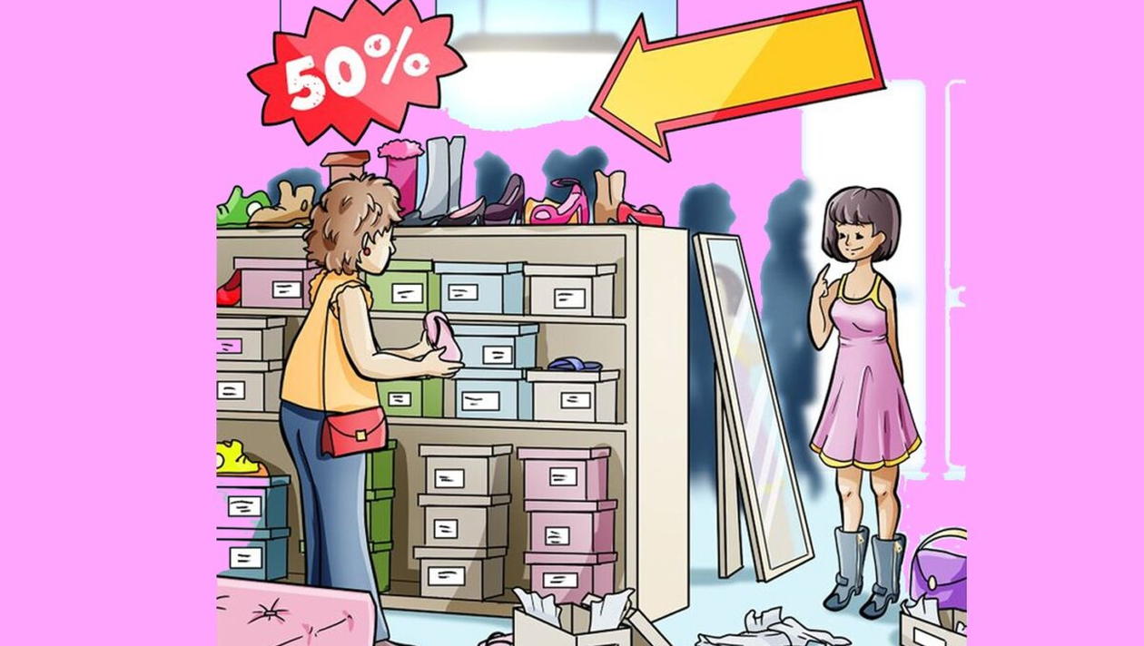 Pe lângă faptul că este distractiv, vei reuși să îți dezvolți capacitatea de a te concentra și atenția. Crezi că ai abilități de observație bune? Hai să vedem! În imaginea de mai sus este prezentată o scenă dintr-un magazin de încălțăminte. O tânără probează de zor mai multe perechi de încălțări, însă puțini își vor da seama ce greșeală s-a strecutat în imagine.