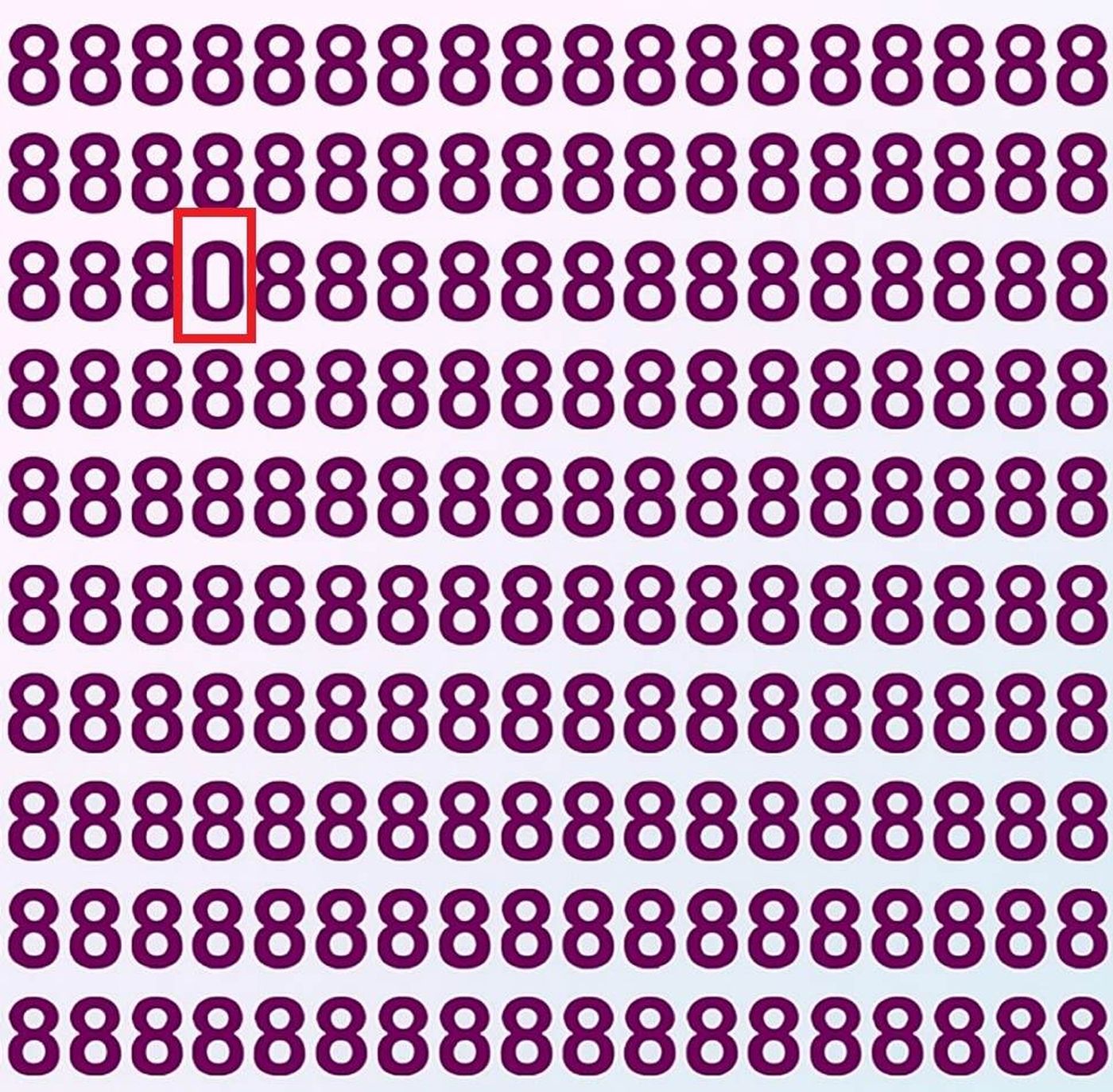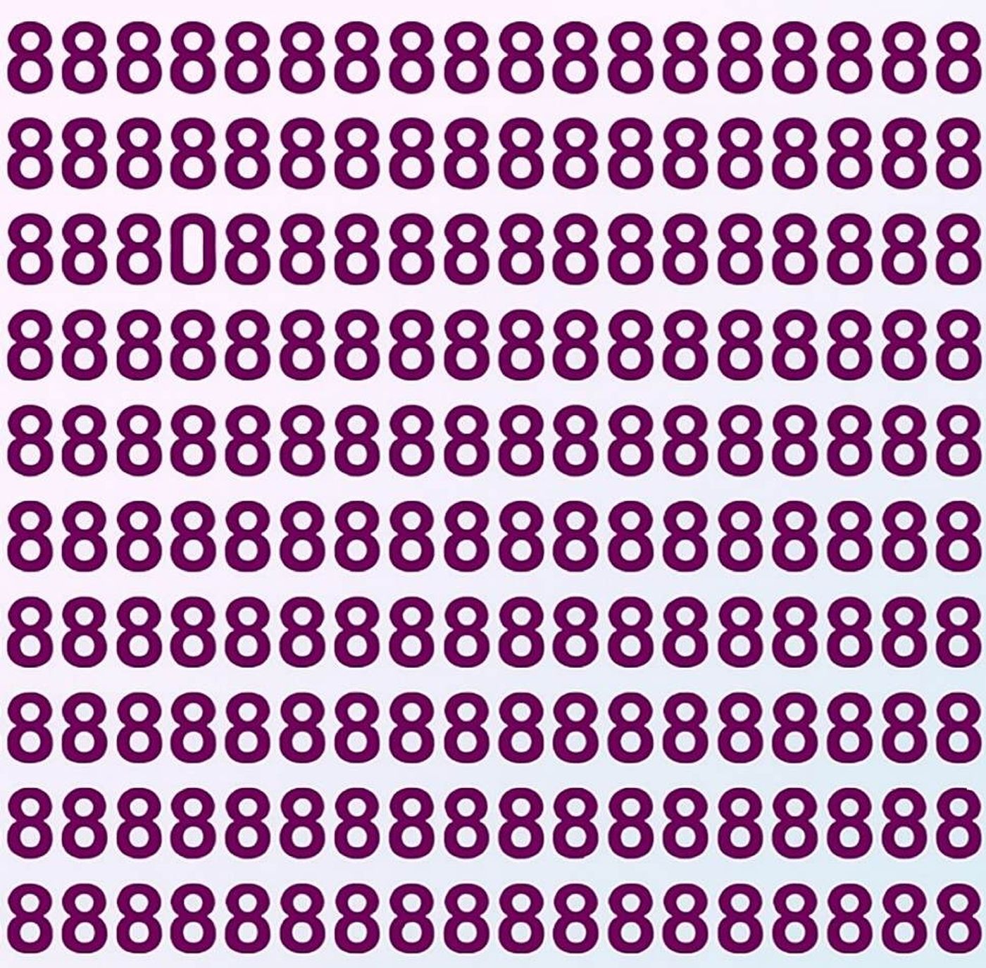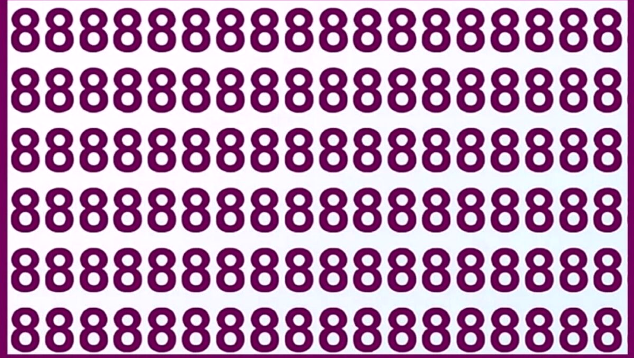 Astăzi îți propunem un test vizual special: găsește cifra „0” ascunsă într-un șir de cifre „8”. La prima vedere, totul pare identic, dar printre toate „8”-urile se află un „0”, ascuns cu atenție. Provocarea este să-l găsești în doar 7 secunde. Doar 1% dintre oameni reușesc să-l descopere atât de rapid, ceea ce face testul un adevărat exercițiu pentru percepție, observație și viteză de reacție.