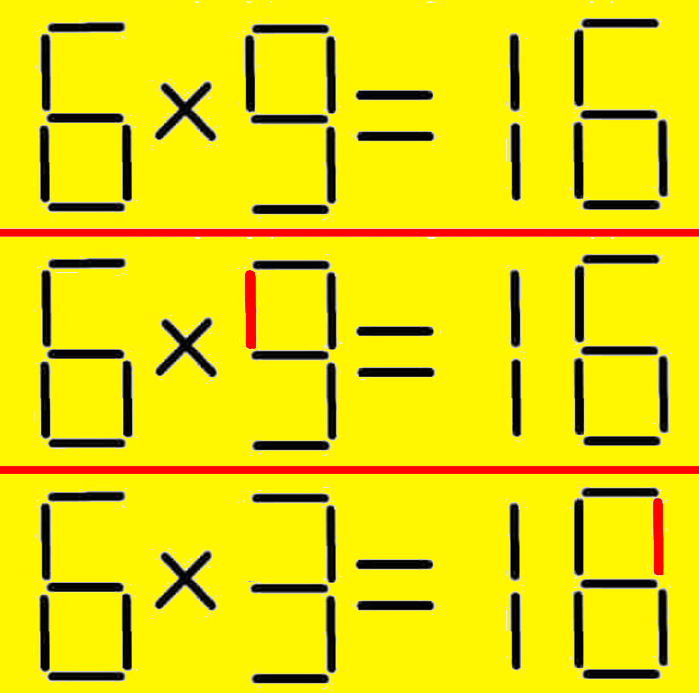 REZOLVARE: Dacă ai fost extrem de atent, ai observat că varianta corectă este 6×3=18. Pentru a ajunge aici, a fost nevoie să muți un băț de chibrit de la cifra 9 și mutat la cifra 16. Ecuația devine 6×3 =18.