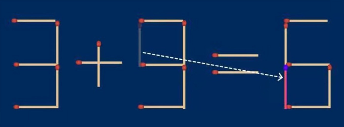 REZOLVARE: Pentru a corecta ecuația 3 + 9 = 5 trebuie să muți un băț de chibrit vertical de la crifra 9 (astfel încât să devină 3) și să îl muți la cifra 5 (astfel încât să devină 6). Prin urmare, ecuația corectă devine 3 + 3 = 6.