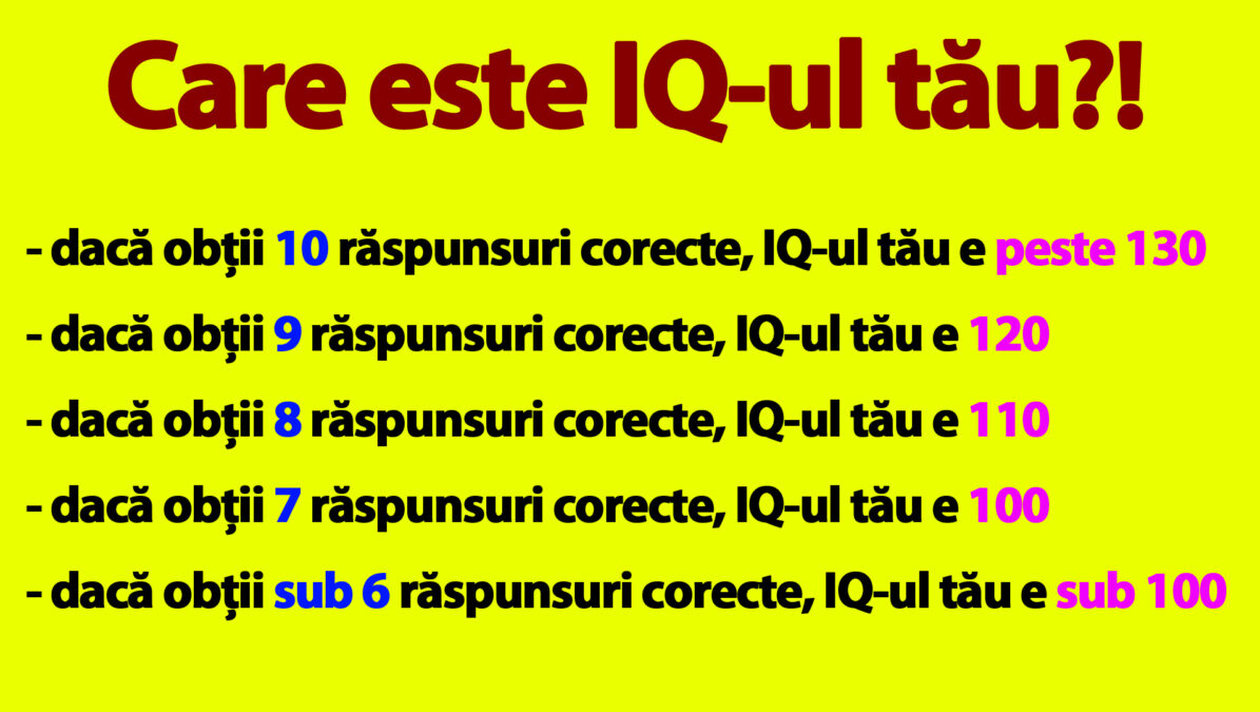 Vrei să știi dacă ești un geniu? Dacă ai un IQ mare? Dacă ai o minte sclipitoare și  poți rezolva rapid orice? CANCAN îţi prezintă un test de inteligență pentru calcularea exactă a IQ-ului cu 10 quiz-uri! Tu știi să le rezolvi pe toate? Intră în galeria foto pentru a rezolva testele și află ce IQ ai!