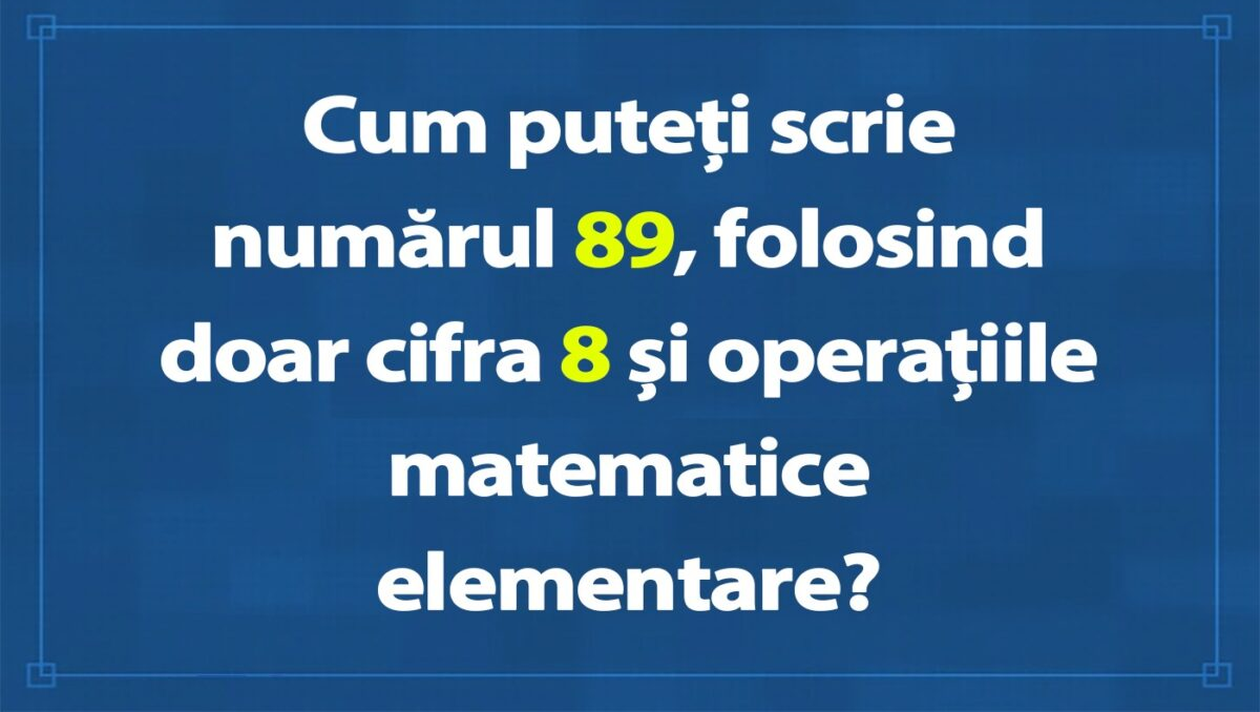 Dragă cititorule, CANCAN.RO ți-a pregătit un test de inteligență exclusiv pentru genii. Cum puteți scrie numărul 89, folosind doar cifra 8 și operațiile matematice elementare? Crezi că reușești să rezolvi provocarea de astăzi? Dacă da, spor la treabă!