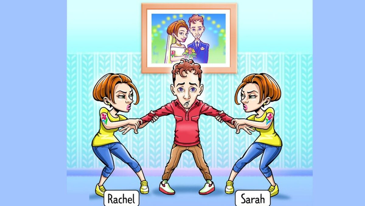 la o scurtă privire a imaginii de mai sus se pot observa două femei care trag de mâinile unui bărbat. Gemenele sunt îmbrăcate în aceeași ținută vestimentară, au părul scurt și tatuaje pe mâini. De altfel, în spatele celor trei personaje se regăsește un tablou. Însă, care este soția bărbatului? Răspunsul este ușor de descoperit, mai ales dacă priviți toate detaliile care apar în imagine. Astfel, dacă priviți tabloul se poate observa cine este soția bărbatului. Răspunsul corect este Rachel, pentru că are tatuaj pe brațul drept.