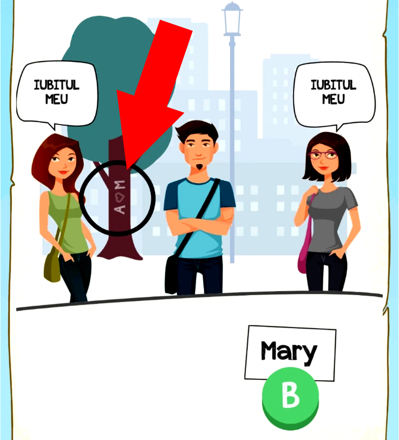 Rezolvare: La o primă vedere, cu toții am fi tentați să spunem că nu există niciun indiciu care să ne arate că una dintre cele două fete este iubita lui Adrian. Totuși, dacă privim cu multă atenție imaginea, se poate observa un detaliu care ne oferă răspunsul corect. Mai exact, pe trunchiul copacului din spatele celor trei tineri se pot observa inițialele A și M, între care este desenată o inimă, simbol al iubirii. Cum cele două litere sunt inițialele numelor lui Adrian și Mary, este clar că cei doi se iubesc și sunt împreună.