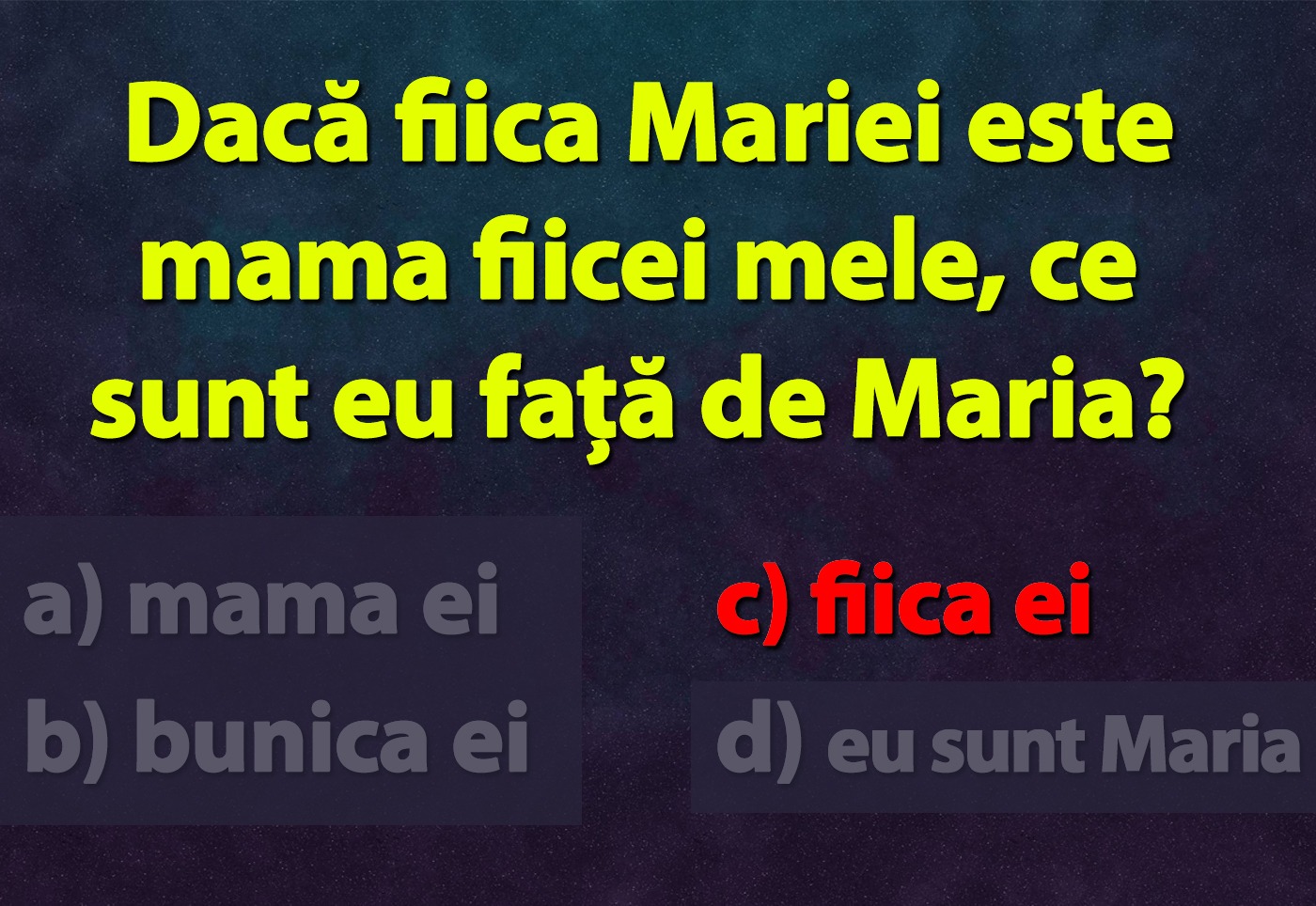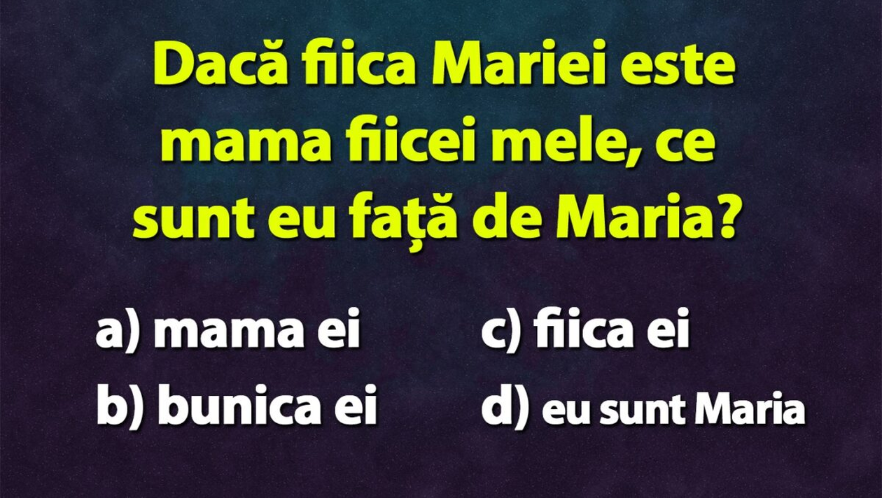Testul este destul de simplu, însă ai nevoie de multă concentrare și logică. Prin urmare, dacă fiica Mariei este mama fiicei mele, ce sunt eu față de Maria?