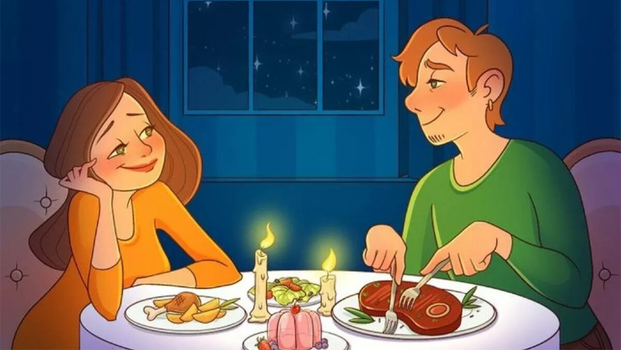 În imaginea prezentată, tot ceea ce trebuie să faci este să identifici greșeala din interiorul imaginii de la cina la lumina lumânărilor. Este ilustrat un cuplu îndrăgostit, care se bucură de timpul petrecut unul alături de celălalt, în timp ce pe masă se află un preparat de-a dreptul gustos.