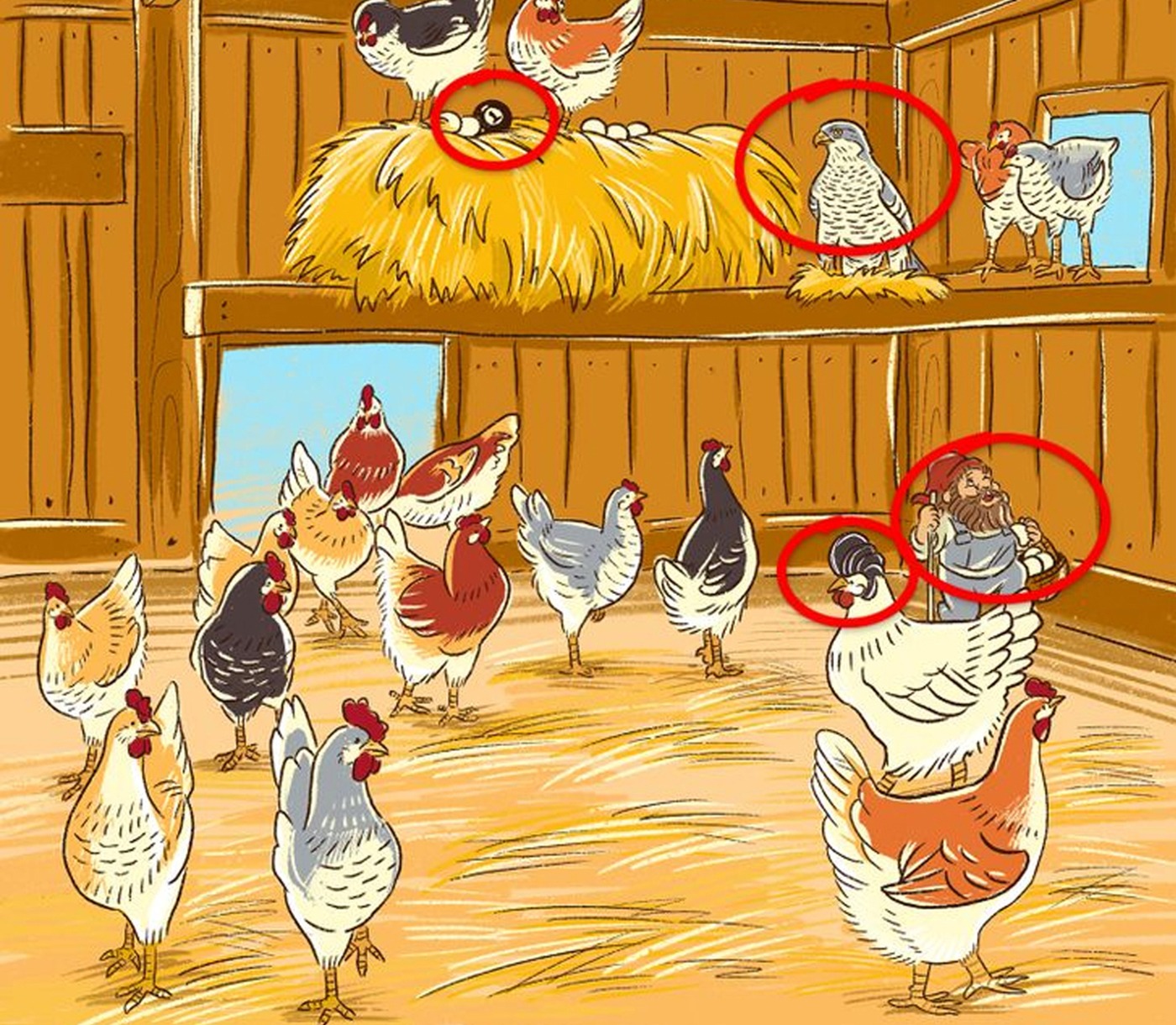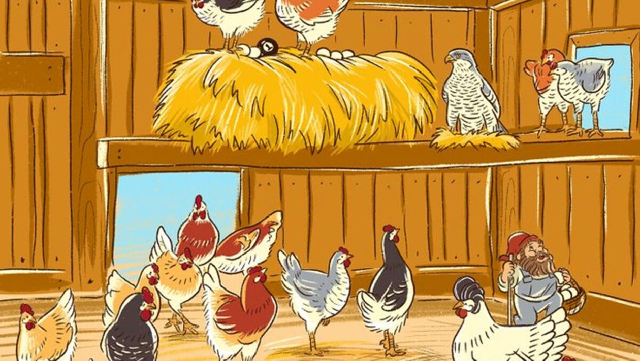 Iată răspunsurile corecte. Cele patru greșeli sunt: uliul, piticul de grădină, bila de biliard și coafura uneia dintre găini.