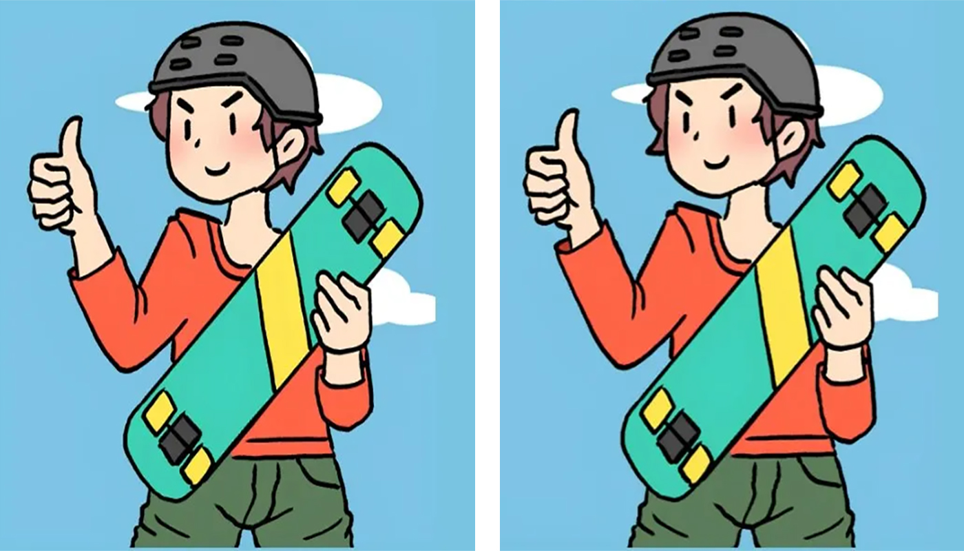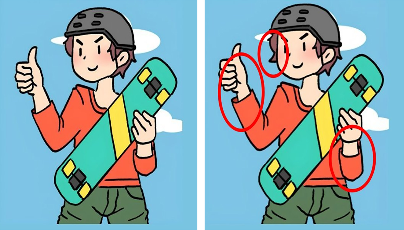 Cele două ilustrații prezintă doi tineri aproape identici, așezați unul lângă celălalt, iar provocarea este să descoperiți cele trei diferențe în maximum treizeci de secunde. La prima vedere par perfect la fel, însă o privire atentă dezvăluie detalii modificate cu grijă.