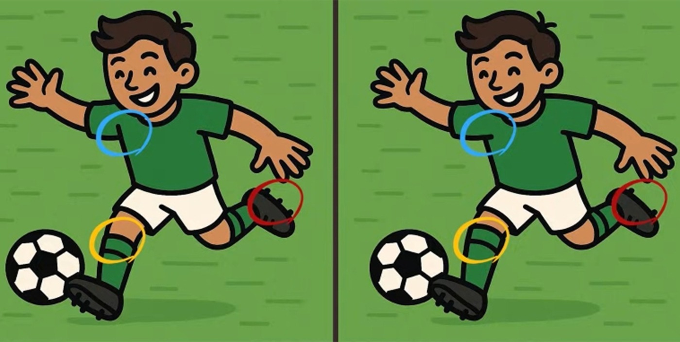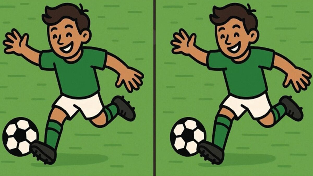 Acum este momentul să-ți testezi abilitățile! Privește cu atenție cele două imagini în care apare un băiat care joacă fotbal. La prima vedere, ele par identice, însă există trei diferențe subtile ascunse între ele. Crezi că le poți descoperi în doar 23 de secunde? Pornește cronometrul și încearcă să le găsești cât mai repede!