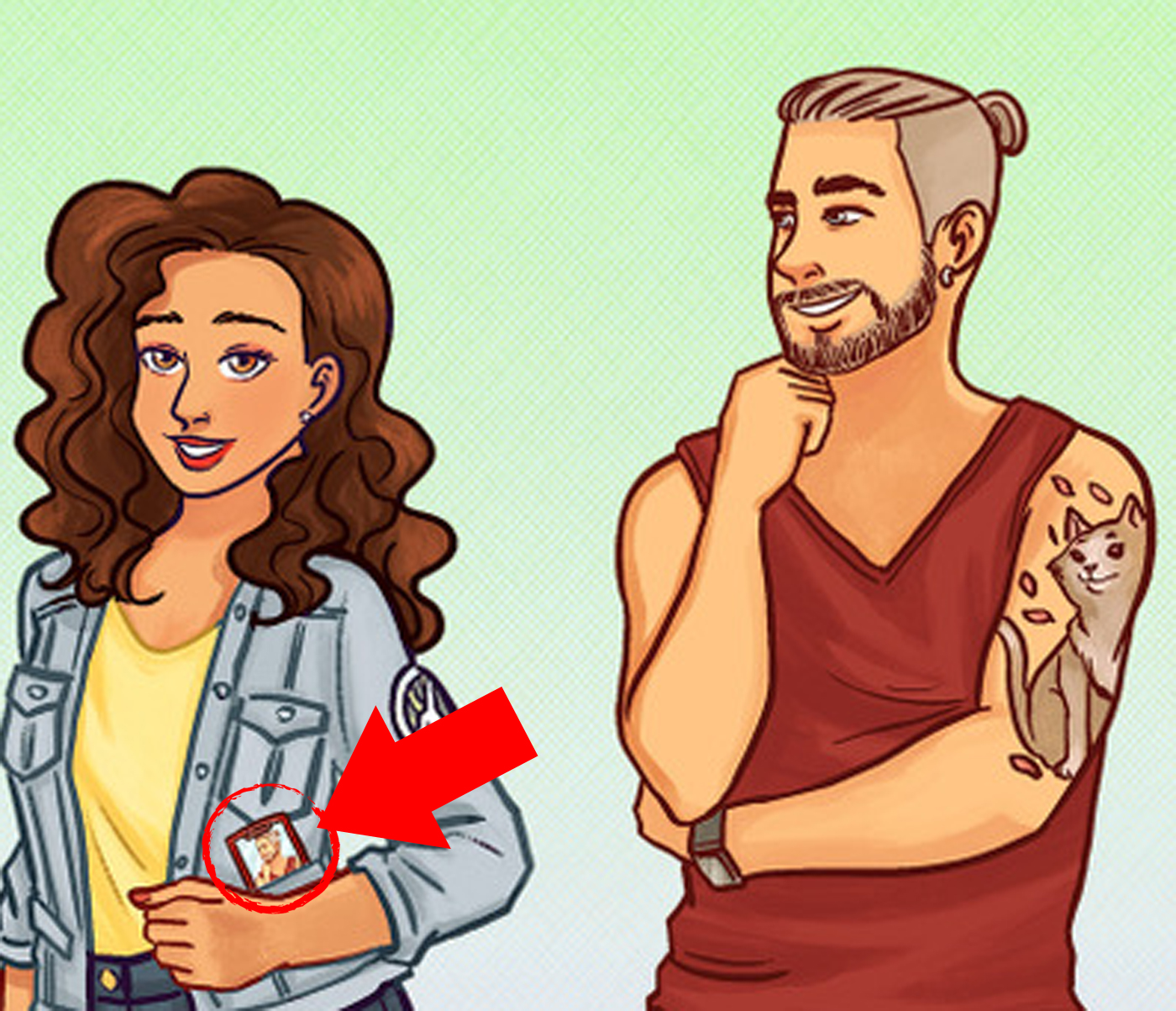 Astfel, dacă priviți cu atenție jacheta tinerei, veți putea observa o fotografie pe care o poartă la brâu, cu bărbatul din dreapta, ce are tatuată o pisică pe braț. Așa-i că nu era chiar atât de greu? Tu ai reușit să ghicești răspunsul corect? Dacă da, felicitări! Ești un adevărat geniu!