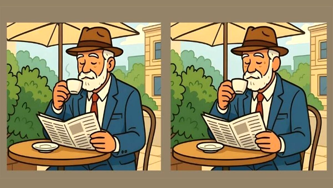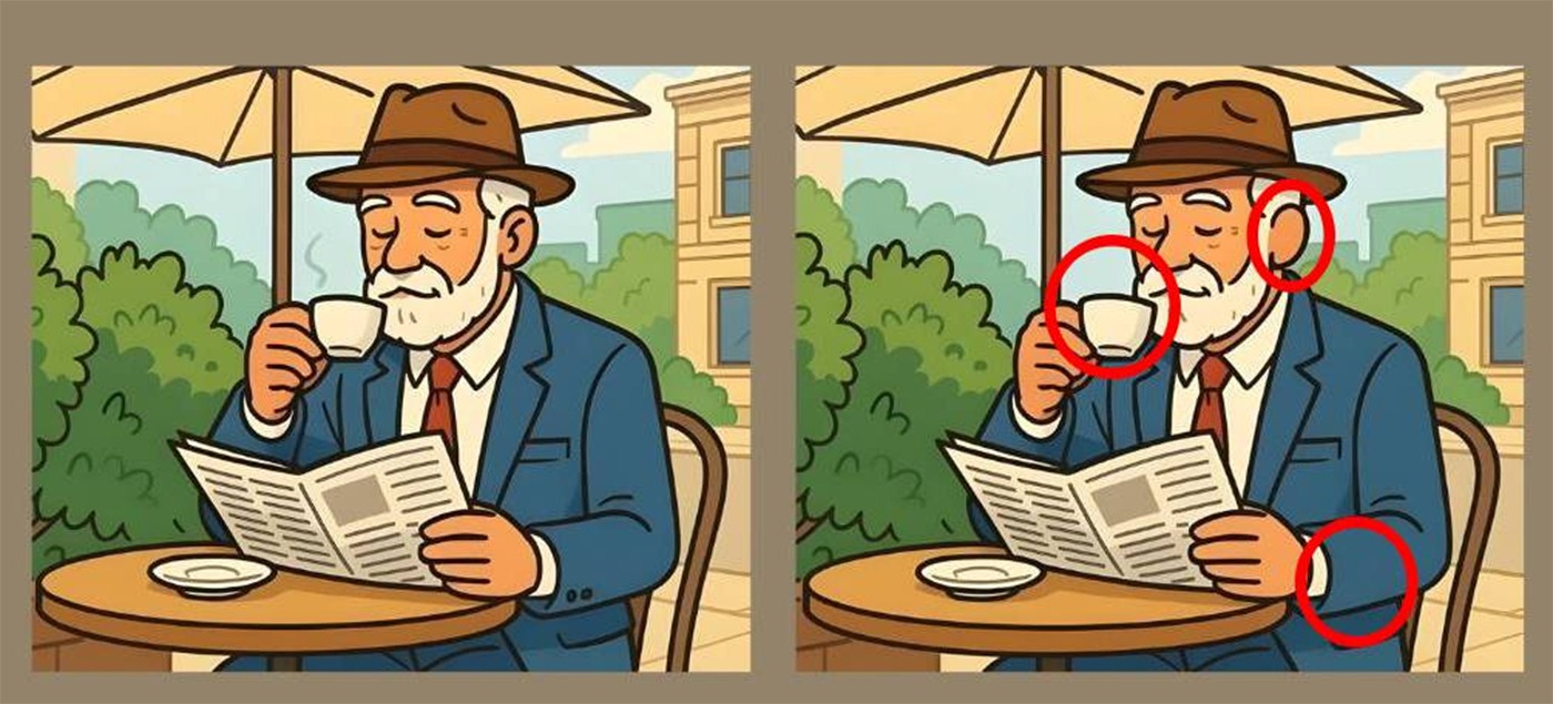 Dacă nici până acum nu ați găsit cele trei diferențe, o să deslușim misterul și o să indicăm exact locul în care acestea apar. Mai exact, prima diferență se găsește la nivelul urechii bărbatului. A doua la nivelul cănii pe care o ține în mână. Iar a treia diferență se vede pe sacou, în dreptul mânecii.