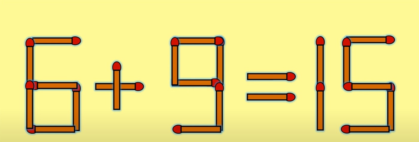 Pentru a corecta egalitatea, tot ce trebuie să faci este să iei bățul de chibrit așezat vertical, din partea stângă-jos a cifrei 0 și să îl așezi la mijloc în poziție orizontală. Astfel, cifra 0 se transformă în cifra 9, iar egalitatea devine corectă: 6 + 9 =15.