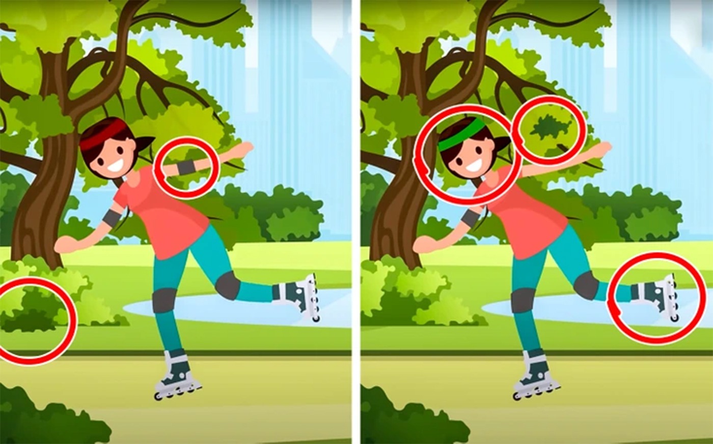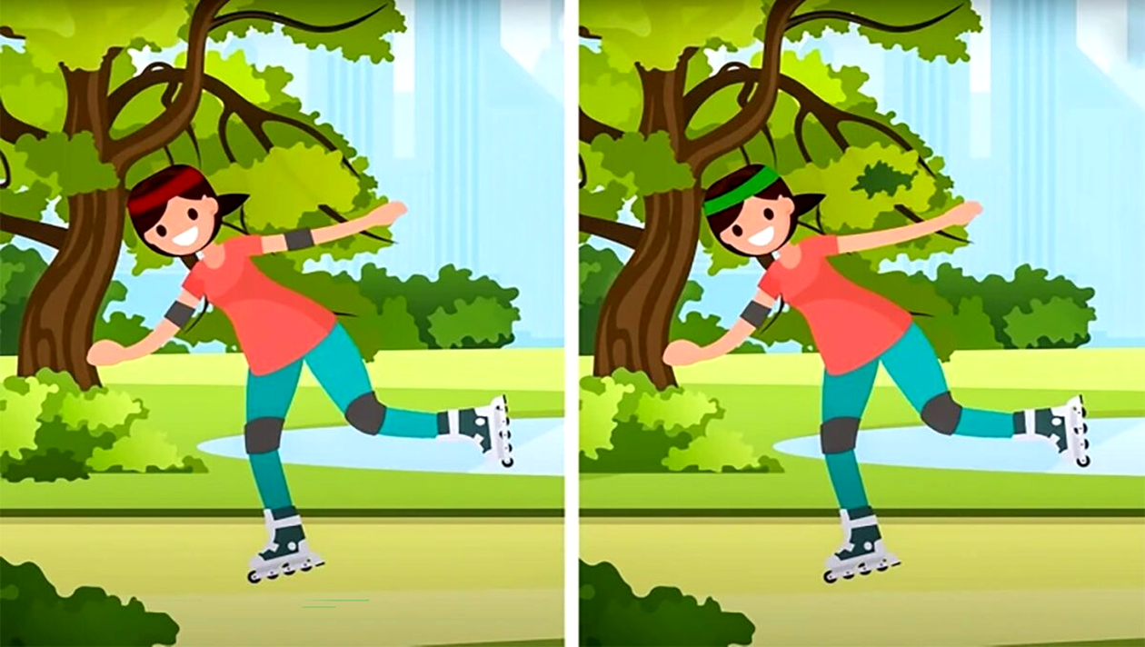 La prima vedere, cele două imagini par trase la indigo: o fată veselă care se bucură de o plimbare pe role, într-un parc plin de verdeață. Cu toate acestea, dacă priviți cu atenție, veți descoperi că aceste fotografii ascund mici detalii care le fac unice. Tu poți să le găsești pe toate?