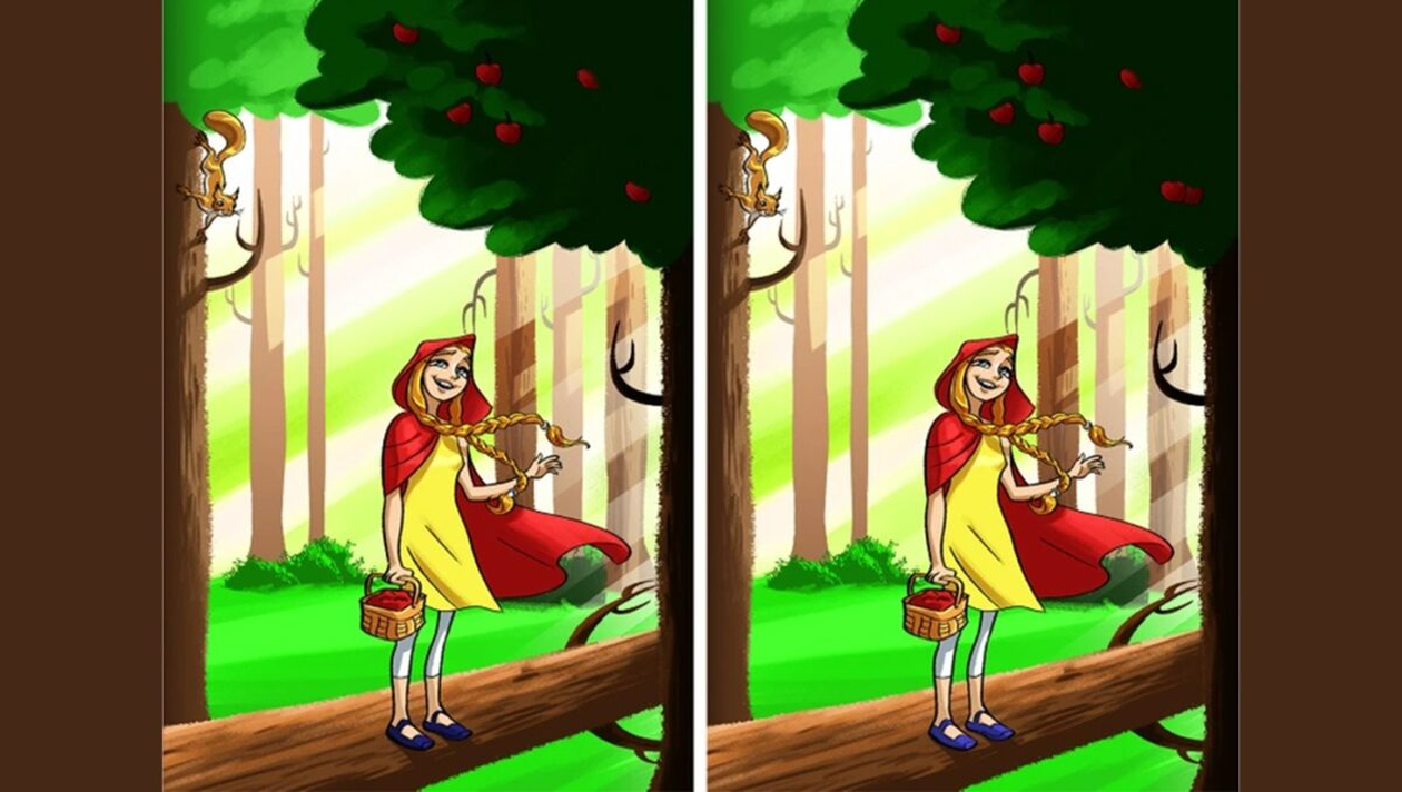 Dacă nici până acum nu ați găsit cele trei diferențe, o să deslușim misterul și o să indicăm exact locul în care acestea apar. Mai exact, prima diferență se găsește la nivelul copacului. Iar a doua este sesizabilă la nivelul pantofilor Scufiței Roșii. Cele două diferențe sunt evidențiate mai jos.