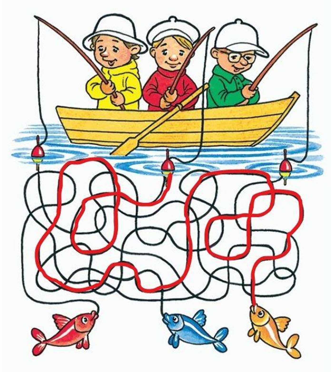Astfel, dacă menținem linia corectă și nu ne încurcăm între fire putem să observăm că pescarul norocos, cel care a reușit să prindă peștișorul de aur, este cel din mijloc, îmbrăcat în bluză roșie.