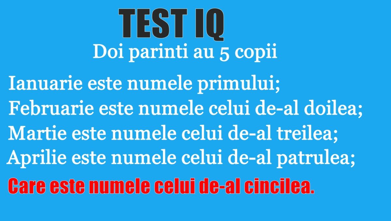 Trebuie să observi, mai întâi, „ecuația”. Există o familie cu cinci copii. Numele lor sunt următoarele: Ianuarie, Februarie, Martie, Aprilie și Care. Pentru că ultimul rând formează, în realitate, o propoziție și nu o întrebare. Astfel, varianta corectă este „Care”. Deci, numele celui de-al cincilea copil este „Care”.