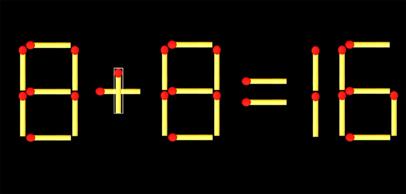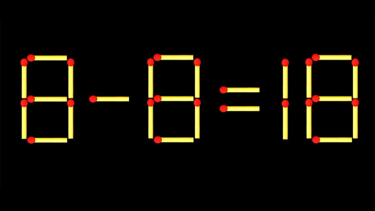 REZOLVARE: Pentru a corecta ecuația 8 – 8 = 18 trebuie să muți un băț de chibrit orizontal de la cifra 8 (din 18) și să îl muți la semnul minus, astfel încât acesta devine plus. Ecuația finală devine 8 + 8 = 16.
