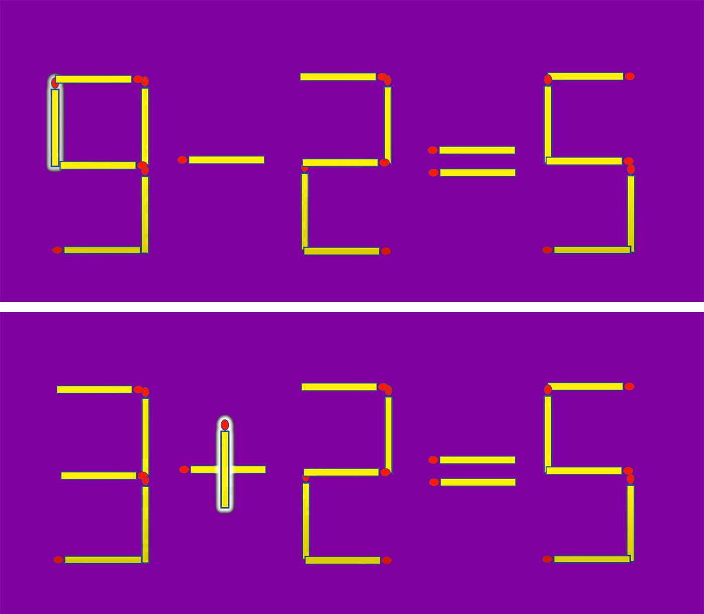 Rezolvare: Pentru a corecta egalitatea, tot ce trebuie să faci este să iei bățul de chibrit așezat vertical în componența cifrei nouă, astfel încât cifra 9 să se transforme în cifra 3. Iar apoi acest băț de chibrit trebuie mutat peste semnul de -, formând astfel semnul +. Așadar, după această mutare egalitatea devine corectă: 3+2 = 5.