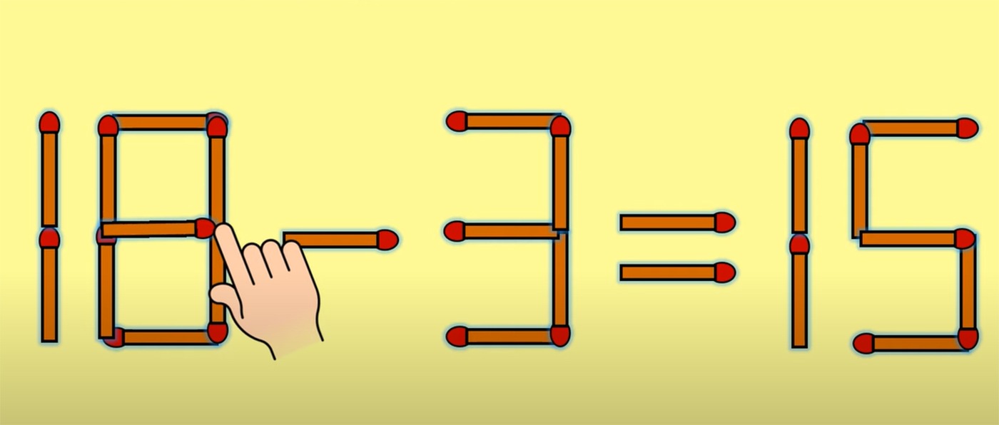 Pentru a corecta egalitatea, tot ce trebuie să faci este să iei bățul de chibrit așezat vertical, în partea stânga-jos din componența cifrei 6, astfel încât aceasta să se transforme în cifra 5. Apoi, acest chibrit trebuie așezat orizontal în interiorul cifre 0, astfel încât să se transforme în cifra 8. Acum egalitatea este corectă. 18 – 3 = 15.