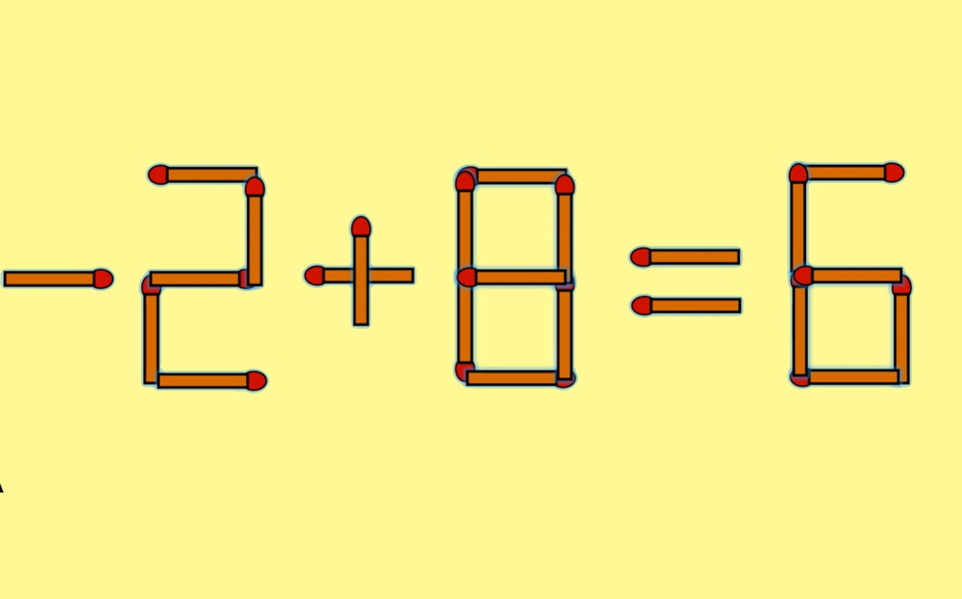 Pentru a corecta egalitatea, tot ce trebuie să faci este să iei al doilea băț de chibrit așezat vertical din componența cifrei 8, de după egal și să îl așezi orizontal, în fața cifrei 2. Astfel, cifra 8 se transformă în cifra 6. După mutarea făcută, egalitatea devine corectă: -2 + 8 = 6.