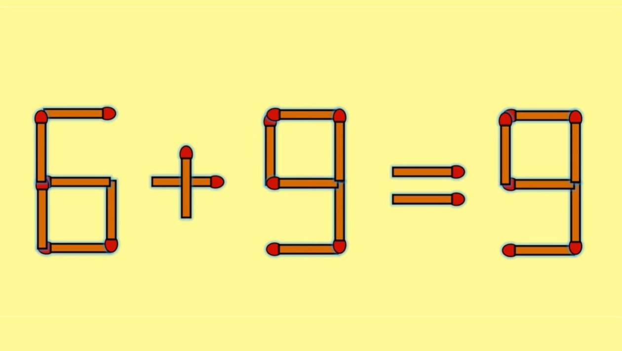 Suntem de acord cu toții că 6 + 9 = 9 este o ecuație greșită. Pentru a o corecta trebuie să muți un băț de chibrit vertical de la cifra 9 (de la rezultatul ecuației) astfel încât să devină 3, apoi să îl muți la începutul ecuației. Prin urmare, ecuația corectă devine – 6 + 9 = 3.