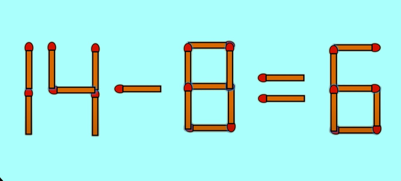 Pentru a corecta egalitatea, tot ce trebuie să faci este să iei bățul de chibrit așezat vertical din componența semnului „+” și să îl așezi în lateralul cifrei 6, tot în poziție verticală. Astfel, cifra 6 se transformă în cifra 8, iar egalitatea devine corectă: 14 – 8 = 6.