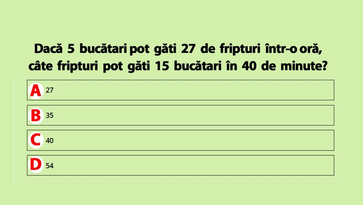 Testul de astăzi are o dificultate ridicată și necesită ceva mai multă atenție și concentrare. Misiunea este aparent simplă. Tot ce trebuie să faci este să descoperi câte fripturi pot găti 15 bucătari în 40 de minute, dacă 5 bucătari pot găti 27 de fripturi într-o oră. Atenţie! Timpul este limitat. Încearcă să găseşti răspunsul corect cât mai repede!