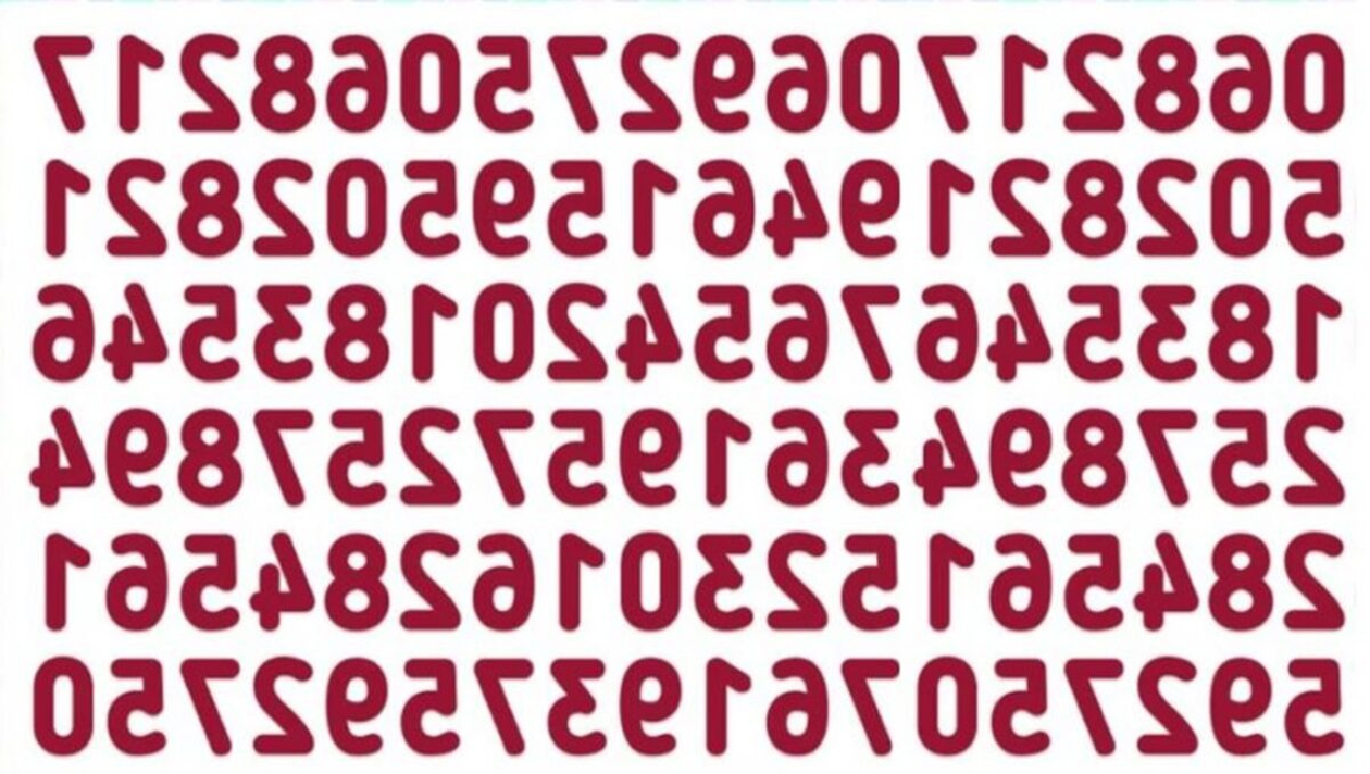 Aceste tipuri de puzzle-uri numerice sunt create pentru a-ți testa atenția și capacitatea de rezolvare a problemelor. În imagine pare că apar doar numere inversate, aranjate în rânduri și coloane, însă printre ele este ascuns un număr de trei cifre: 523. Provocarea este să îl găsești în cel mult 15 secunde. Privește cu atenție, concentrează-te și încearcă să descoperi modelul care te va ajuta să identifici numărul ascuns.