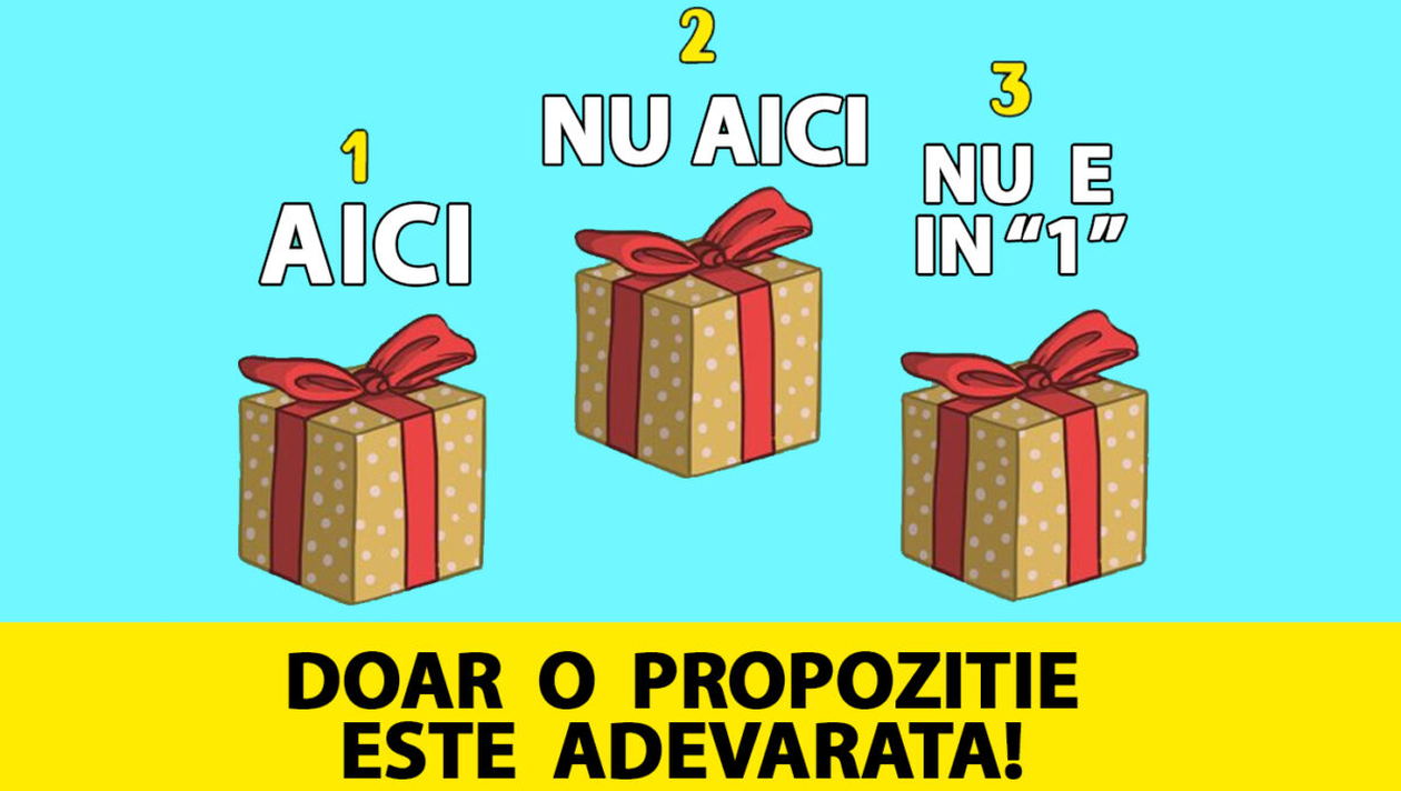 În imaginea de mai sus, trebuie să descoperi în care dintre cele trei cutii de cadou se află inelul. Testul poate fi interpretat sub forma unui puzzle. Pentru fiecare cutie în parte există câte o afirmație: