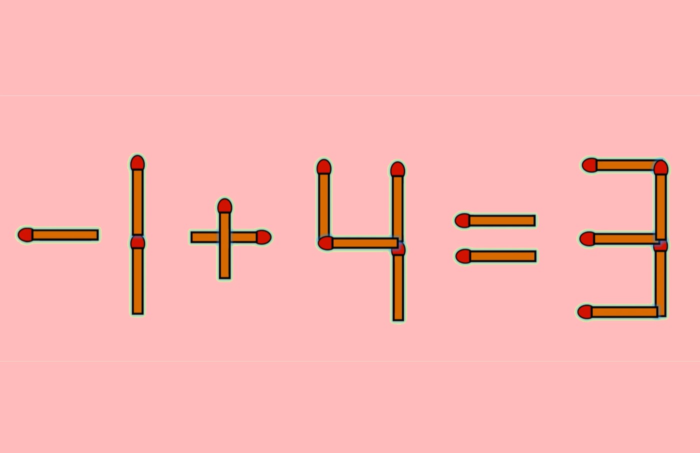 Pentru a corecta egalitatea, tot ce trebuie să faci este să iei bățul de chibrit așezat orizontal din componența cifrei 7 și să îl atașezi în aceeași poziție în fața cifrei. Astfel, cifra 7 se transformă în – 1. După mutarea făcută, egalitatea devine corectă: – 1 + 4 = 3.