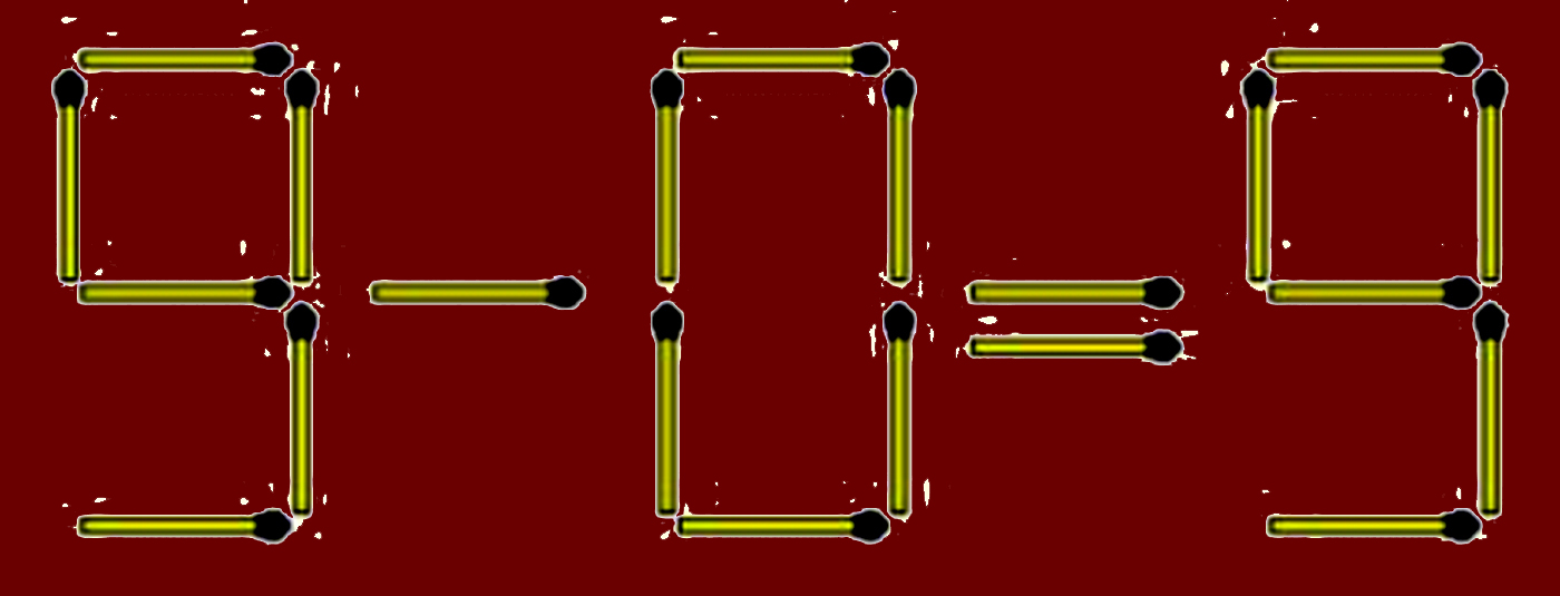 Pentru a obține ecuația corectă, trebuie să adăugați 1 băț de chibrit în partea stângă a numărului 3 astfel încât să devină 9. Apoi, să adăugați 1 băț de chibrit în partea dreaptă a numărului 5 astfel încât să devină 9. Așa veți putea corecta ecuația.