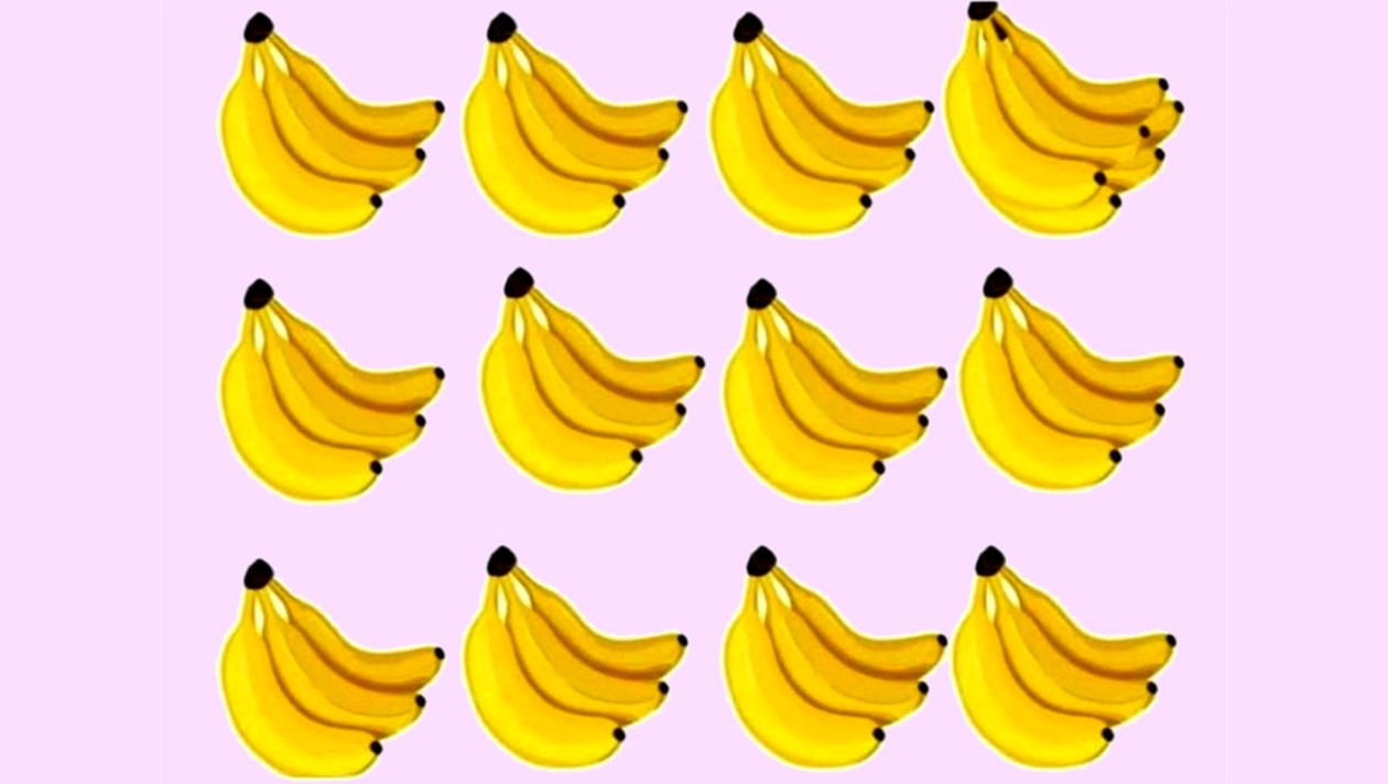Bananele sunt poziționate atât de aproape încât curbele lor se suprapun ușor, iar asta te poate face să ratezi una sau să te îndoiești de numărătoare. Acordă o atenție mai mare aranjamentului. Unele banane ar putea fi pe jumătate ascunse sau ar putea apărea în spatele altora. Galbenul te poate face să numeri greșit. Nu încerca să te grăbești în timp ce numeri. Scanează imaginea cu ochi de vultur. Examinează fiecare mănunchi cu mare atenție.